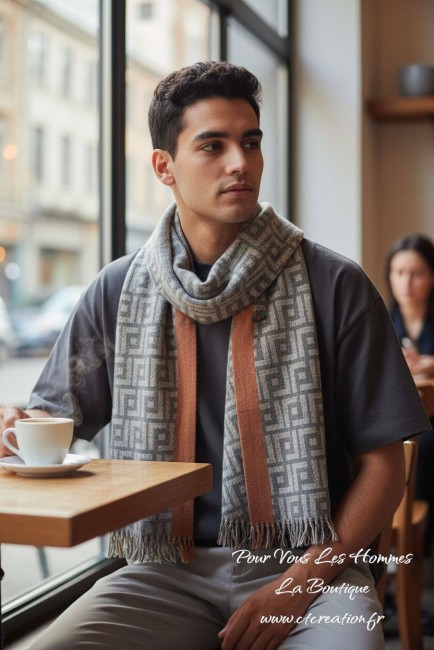 L’écharpe est assez large, permettant de l’enrouler confortablement autour du cou tout en laissant de belles retombées devant la poitrine, renforçant l’impression de confort et d’élégance