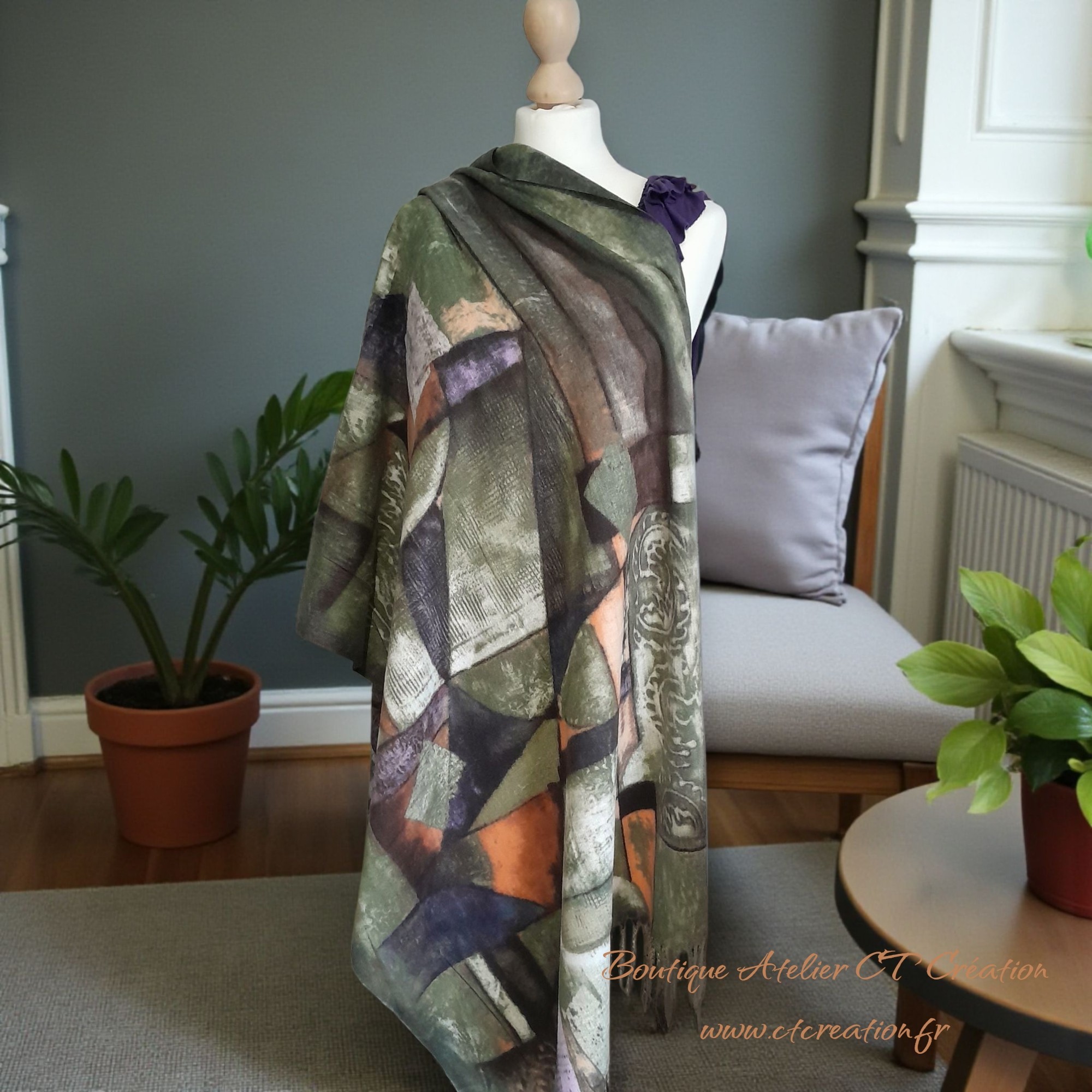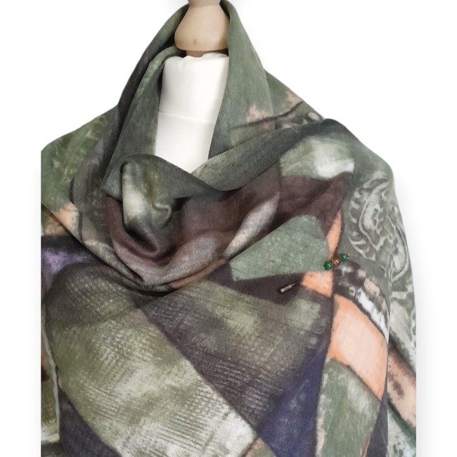Découvrez cette magnifique Echarpe élégante avec un motif artistique et graphique dans des tons verts, beiges et bruns.