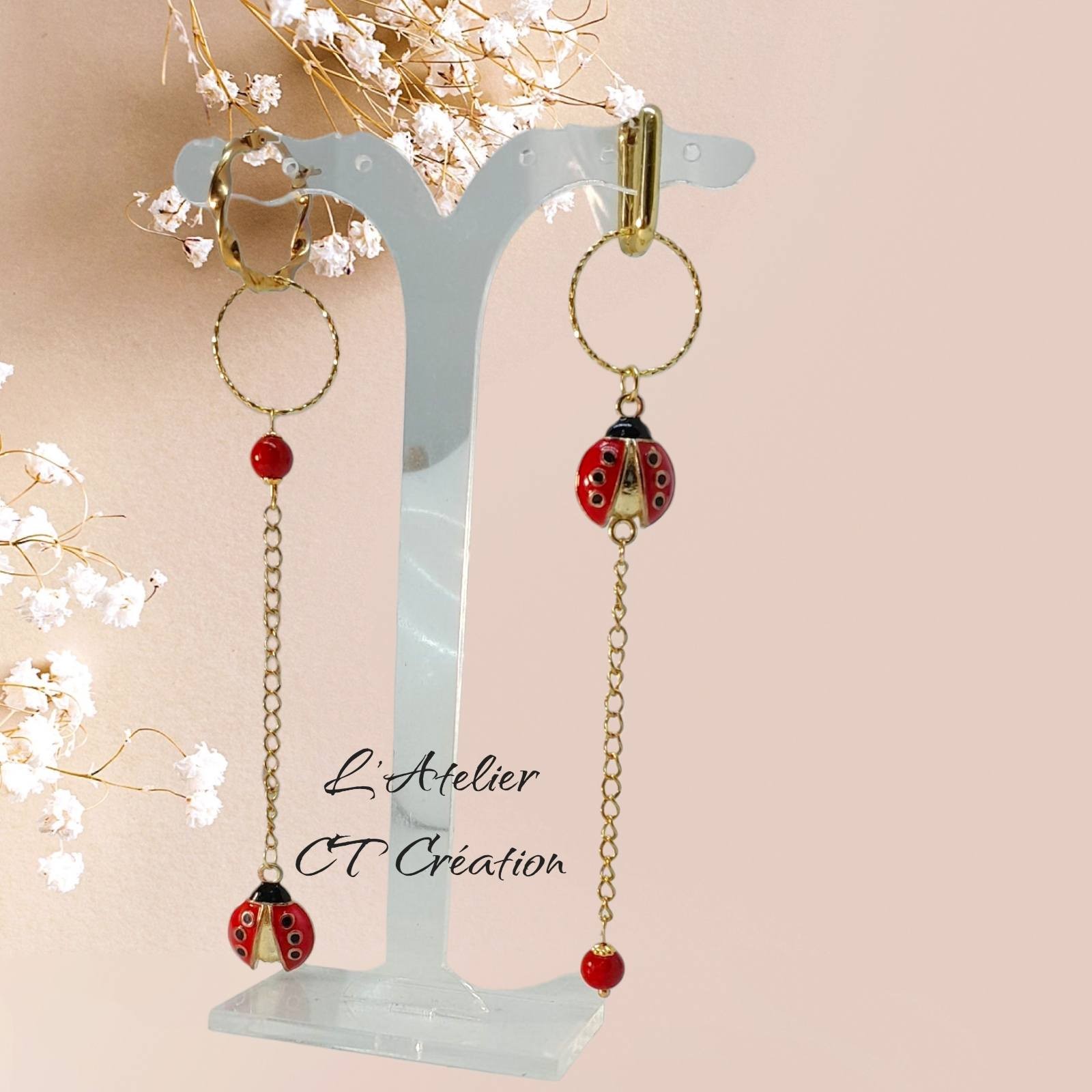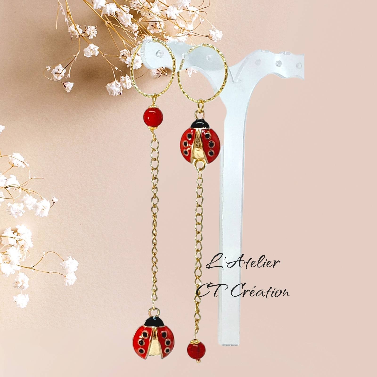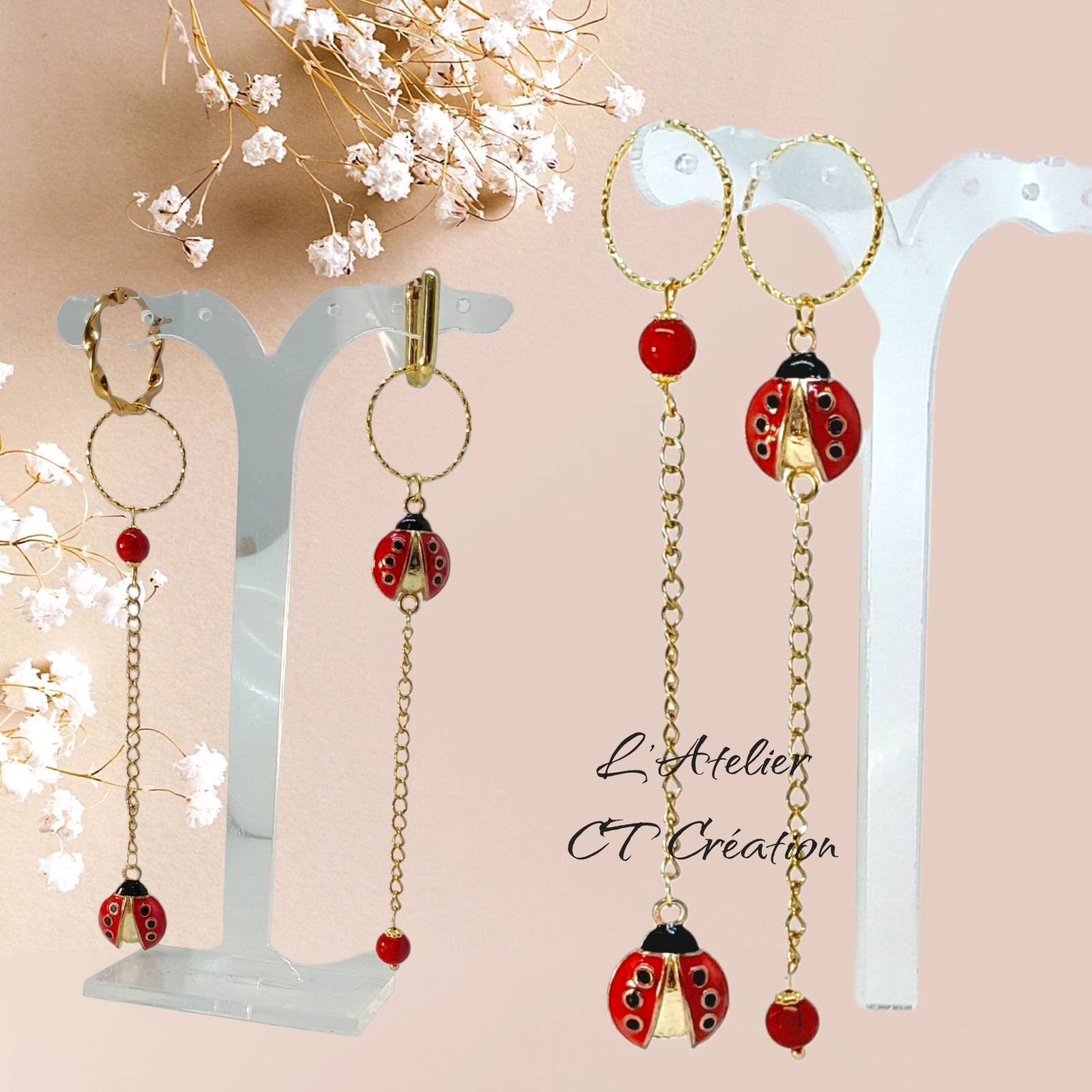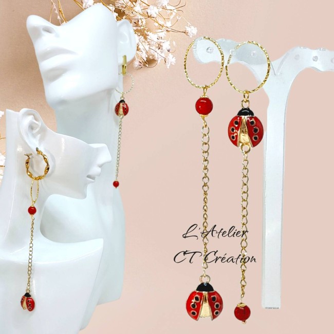 2 Magnifiques longs pendentifs pampilles en laiton Coccinelle avec perles en corail (anneaux de suspension en plaqué or)