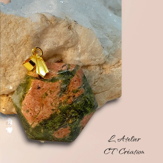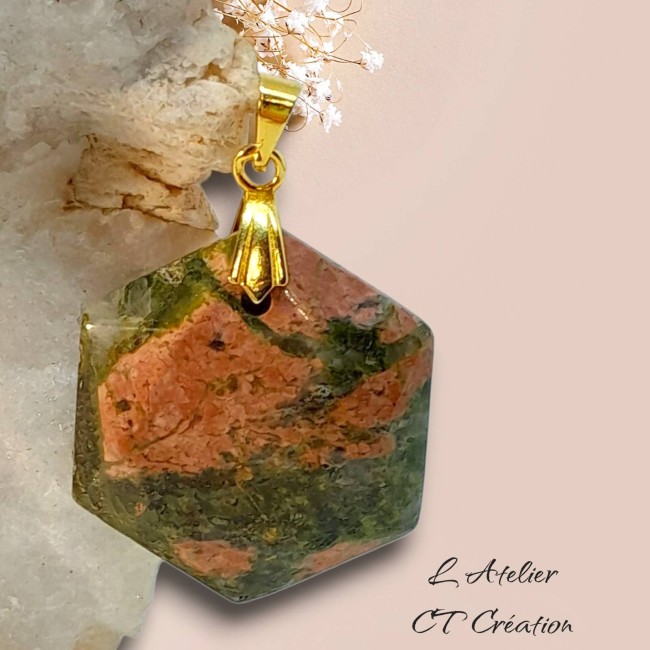 Magnifique Collier pendentif d'Unakite à la forme originale octogonale