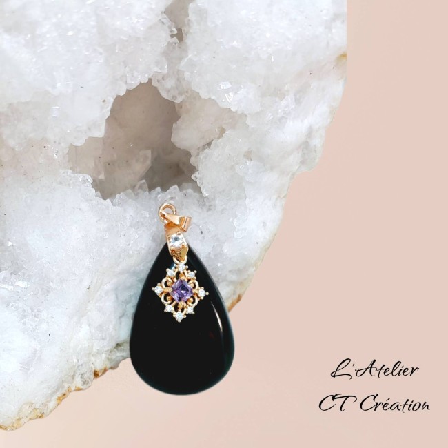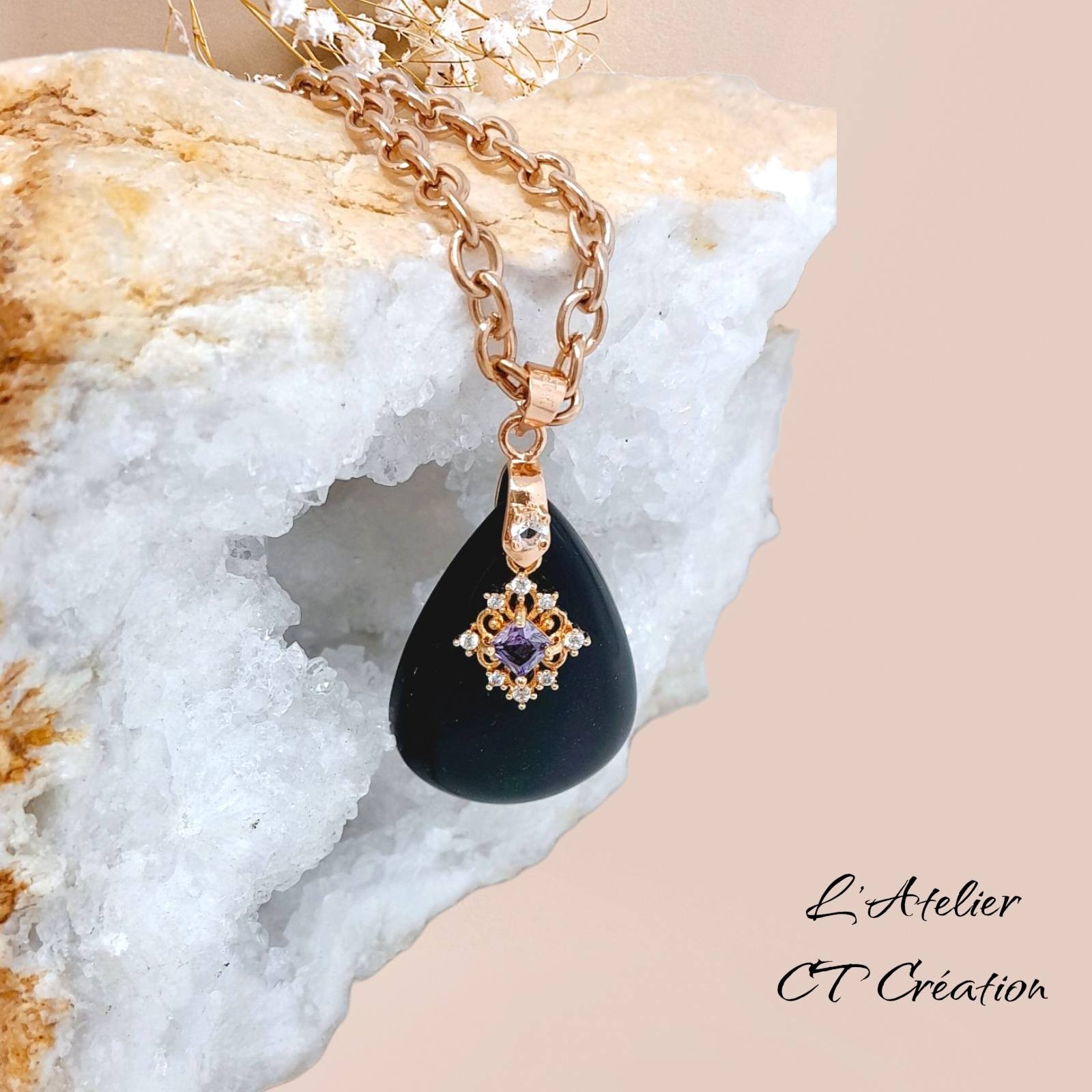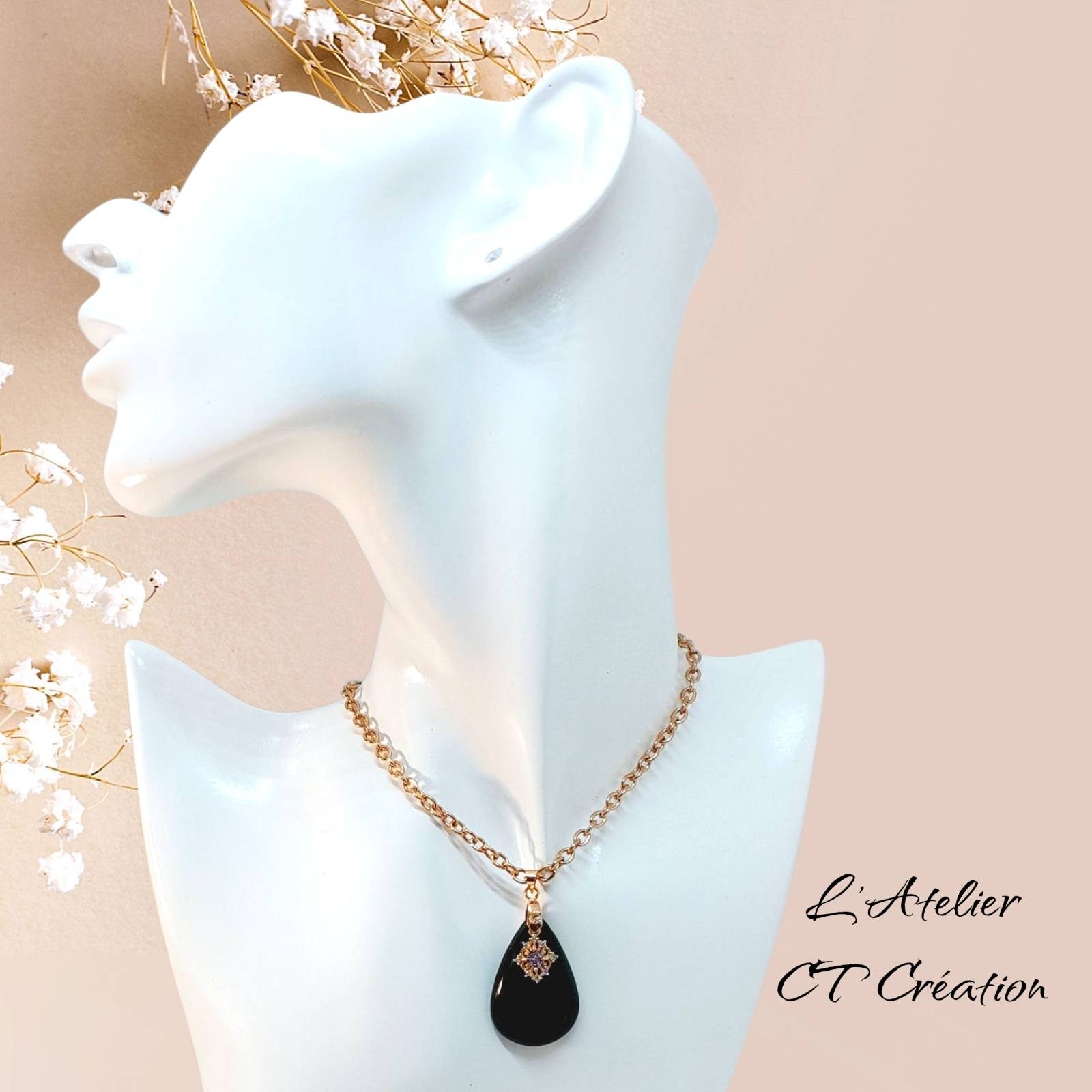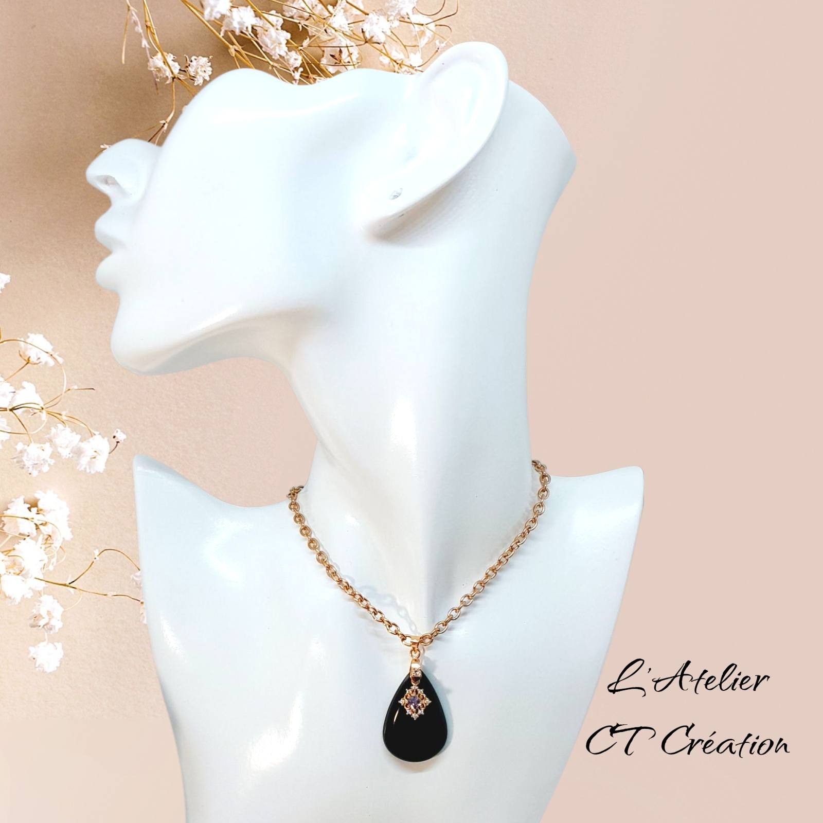 Collier pendentif Onyx noir forme goutte très originale avec son pendentif en cristal et dentelle de métal