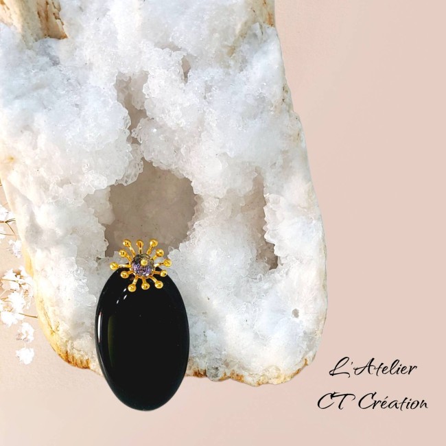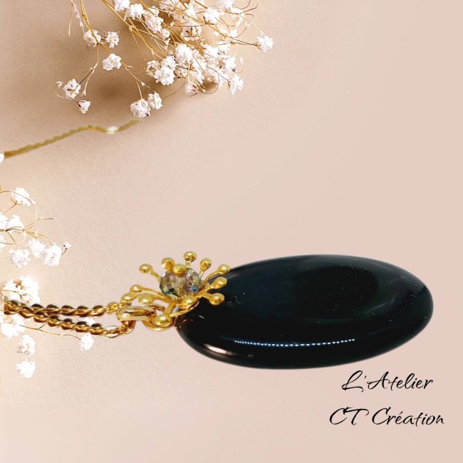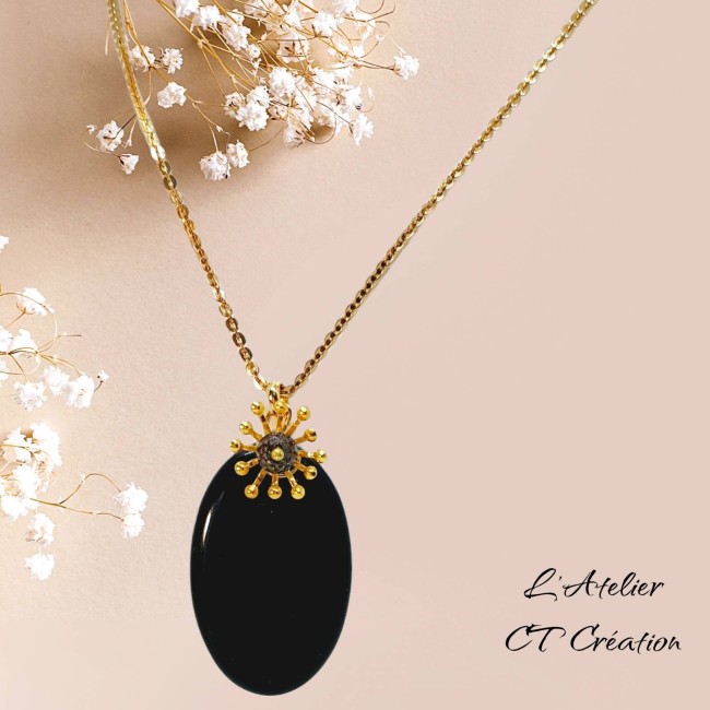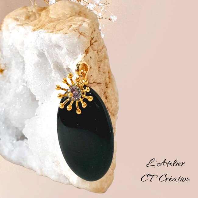 Collier pendentif Onyx noir forme ovale très originale avec sa bélière florale et son cristal autrichien au centre