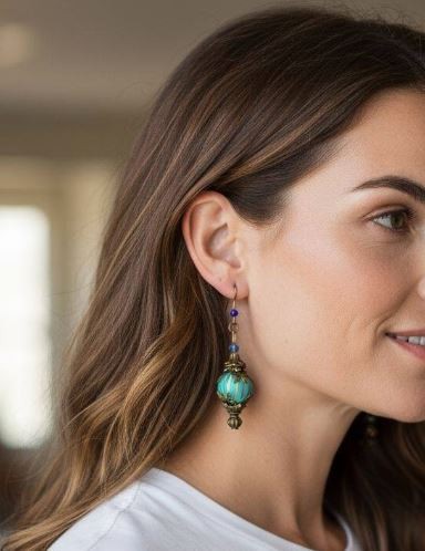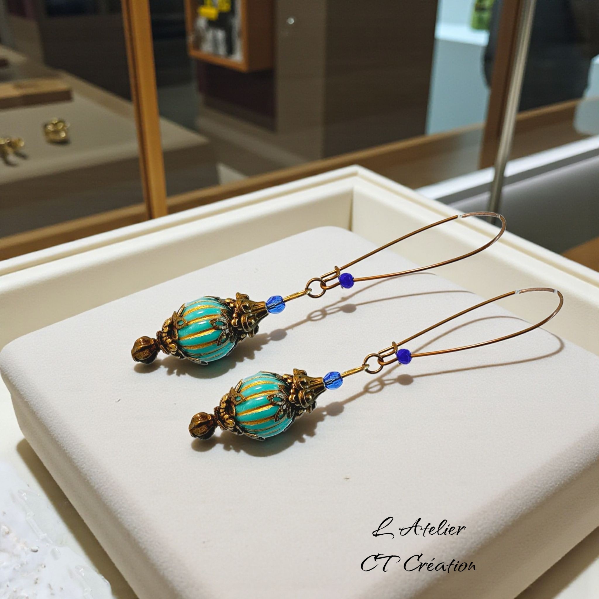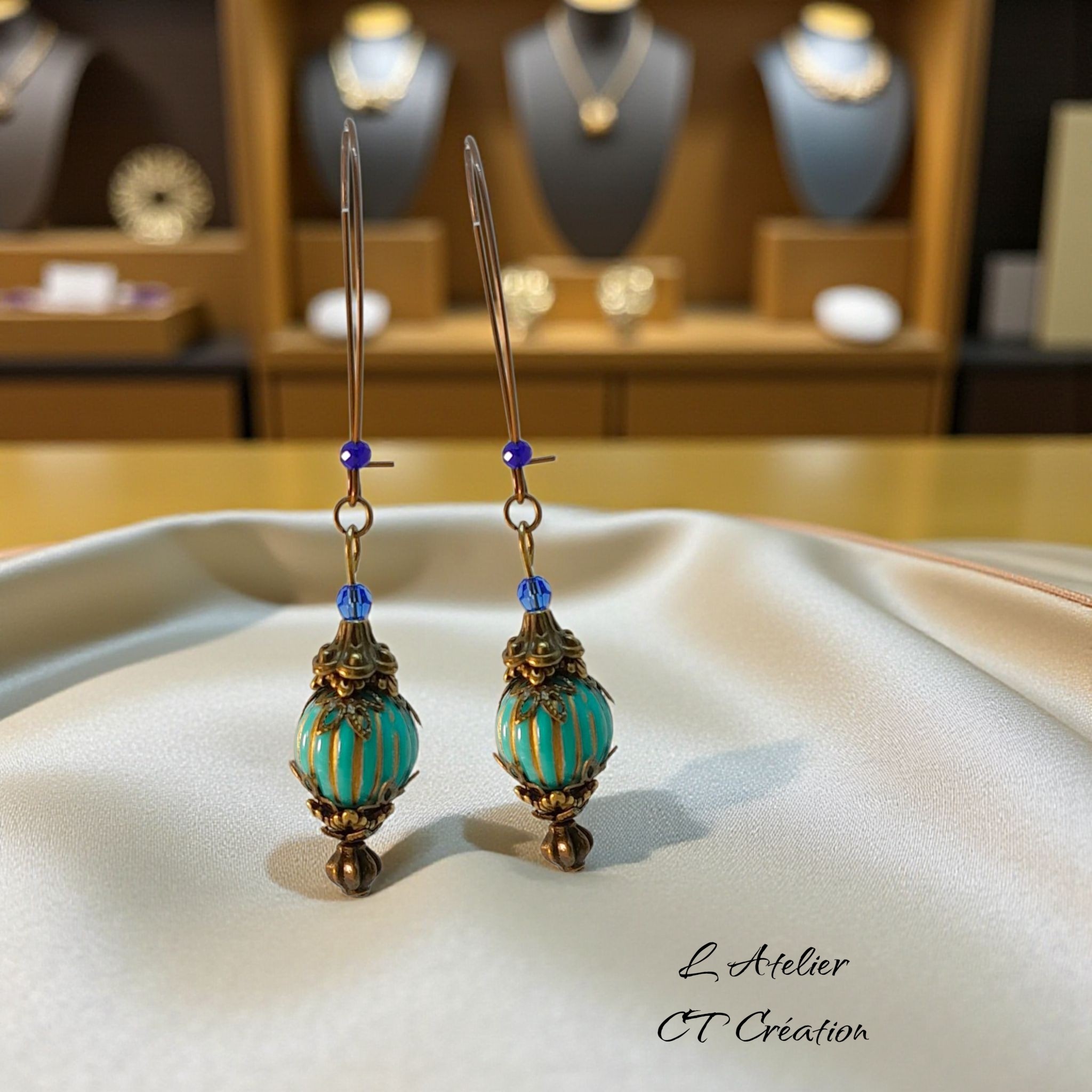 Boucles d'oreilles pendentifs réalisées avec des coupelles florales en bronze, perles en résine forme citrouille 10mm, perles en Cristal Autrichien et perles en verre