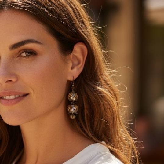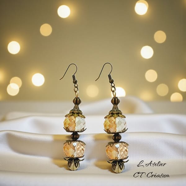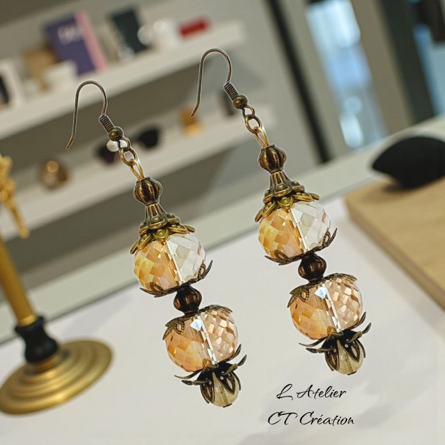 Boucles d'oreilles pendentifs réalisées avec des coupelles florales en bronze, perles rondelles en Cristal à facettes, perles en citrine