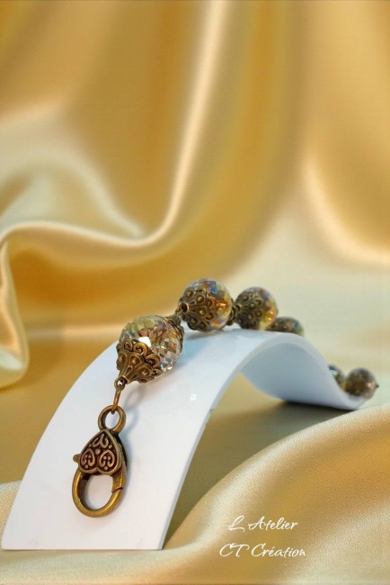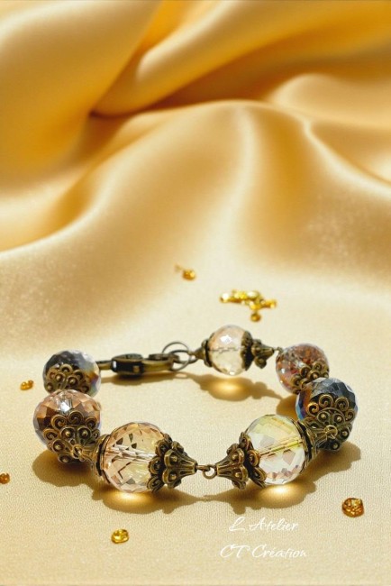 Bracelet réalisé en atelier avec des coupelles florales en bronze, perles rondelles en Cristal à facettes