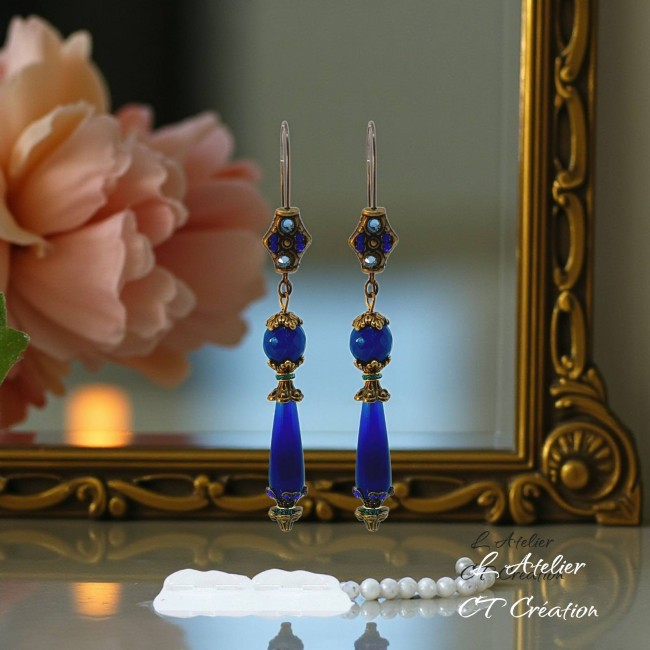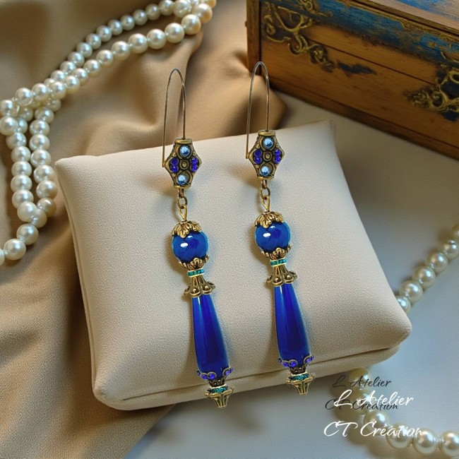 Magnifiques Boucles d’Oreilles pendentifs gouttes et perles à facettes en Agate bleu extra