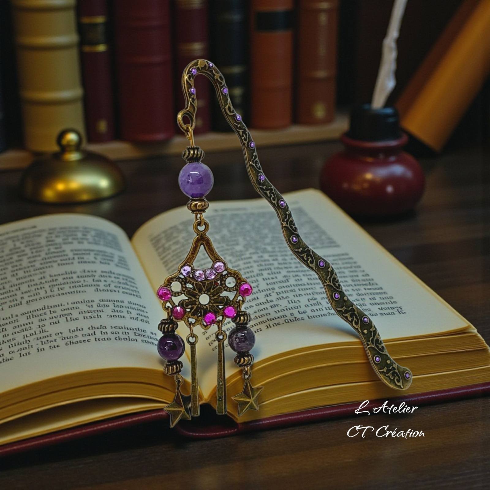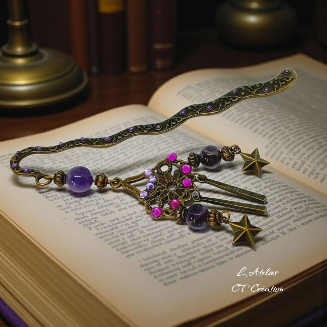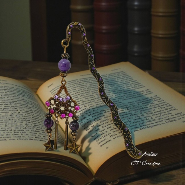 Marque page en bronze gravé avec incrustation de micro billes violettes