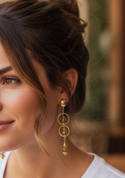 Boucles d'oreilles pendentifs "Attrape Soleil" réalisées avec des coupelles en acier doré, perles rondelles en Cristal à facettes 87mm suspendues des intercalaires ronds plaqué or 18 crts