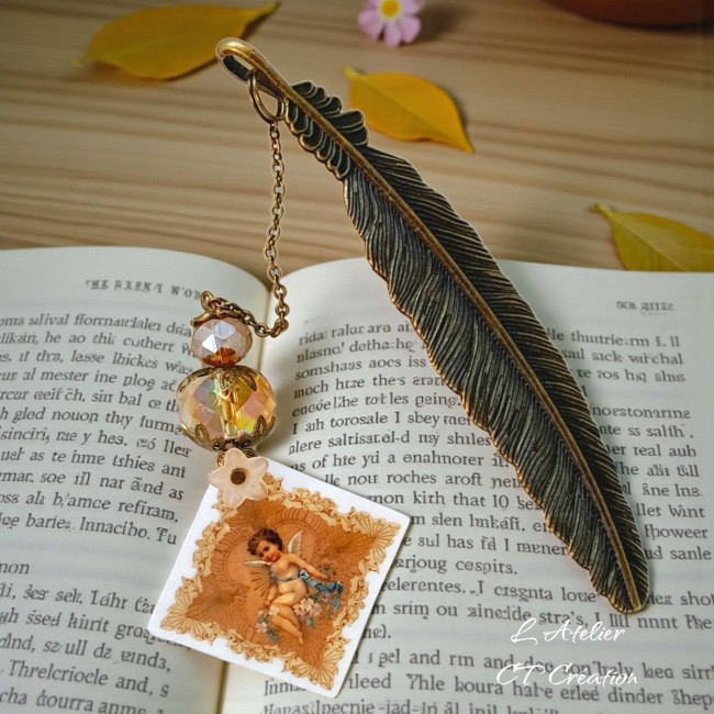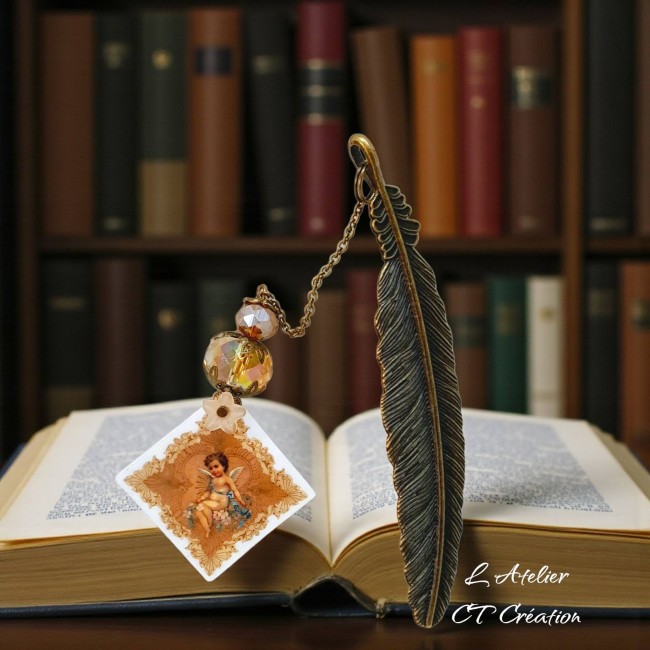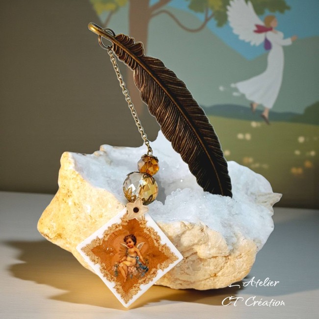 Marque page en Bronze Plume avec pendentif perles en Cristal et Ange