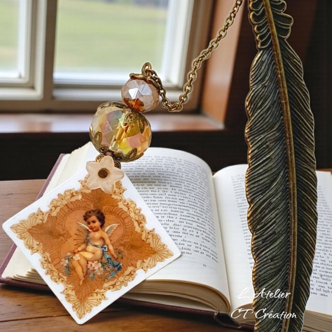 Dimension : 10cm (marque page) - 12cm (pendentif Ange et perles)
