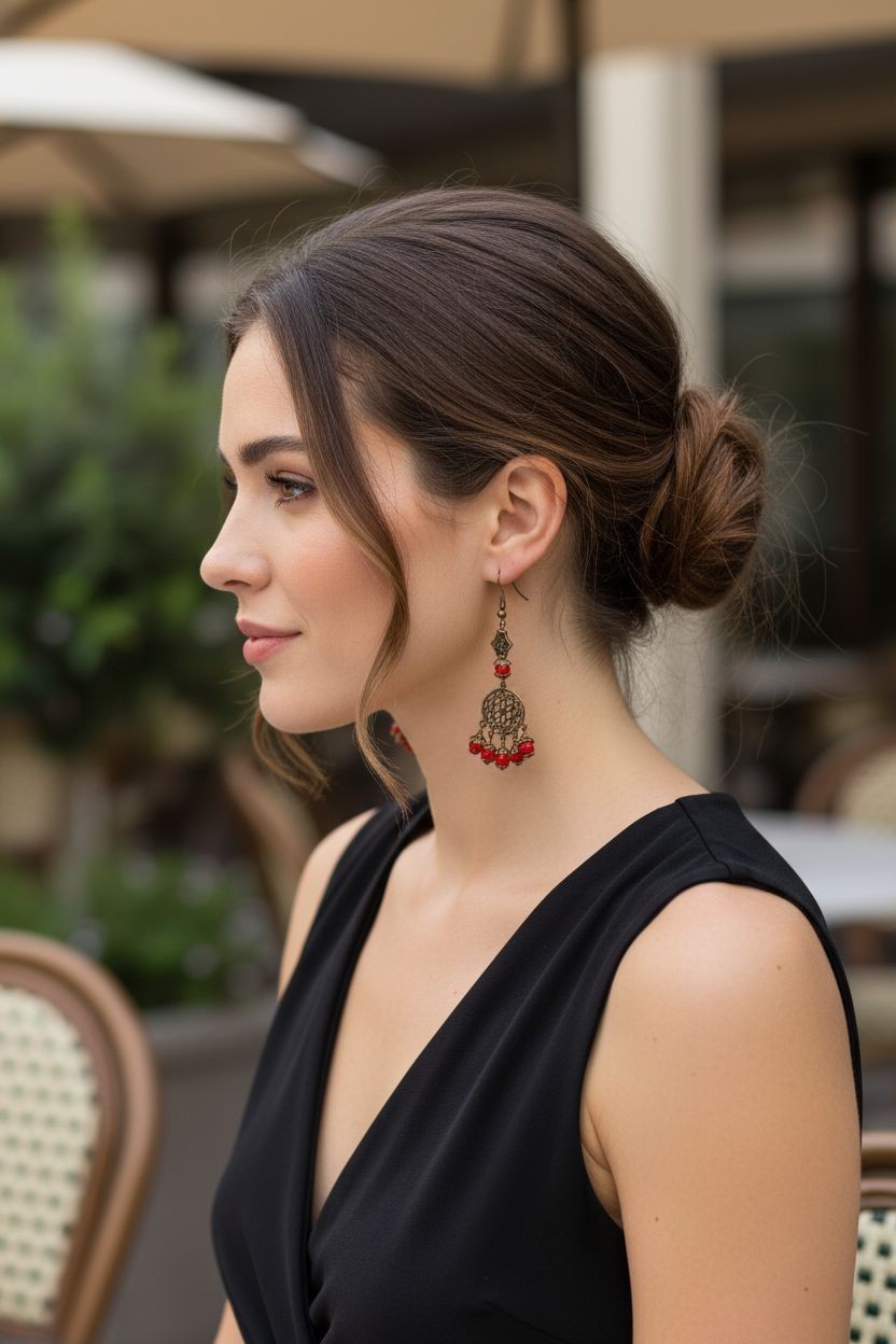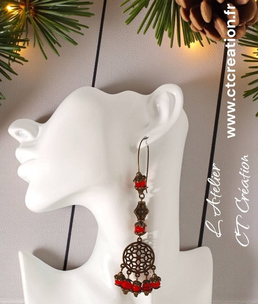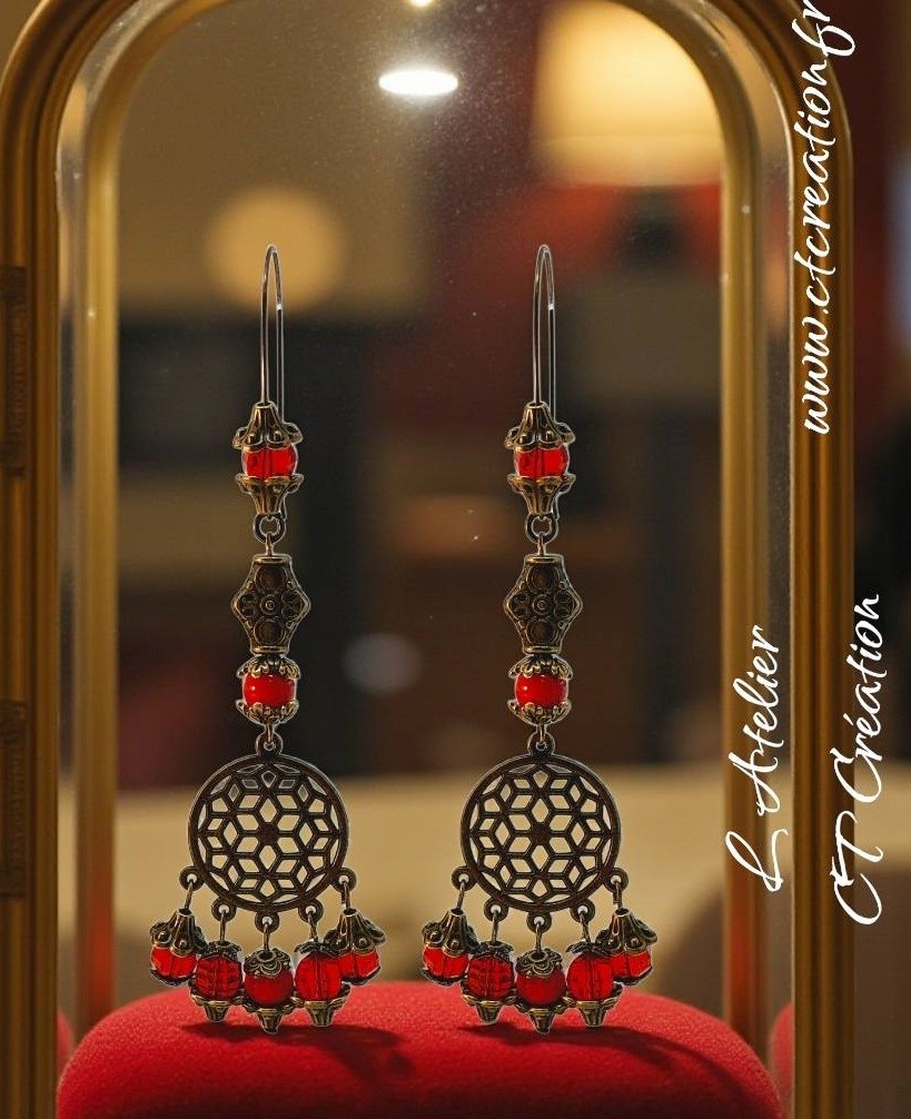 Boucles d'oreilles longs pendentifs "Attrape Rêves" en bronze réalisées avec des perles en cristal facettées et perle en corail pierre naturelle au centre