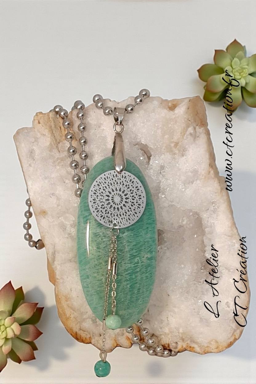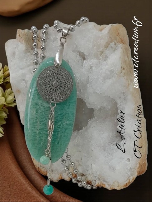 Agrémenté d'une médaille en dentelle de métal mandala et 2 perles pendentifs finition perles en amazonite