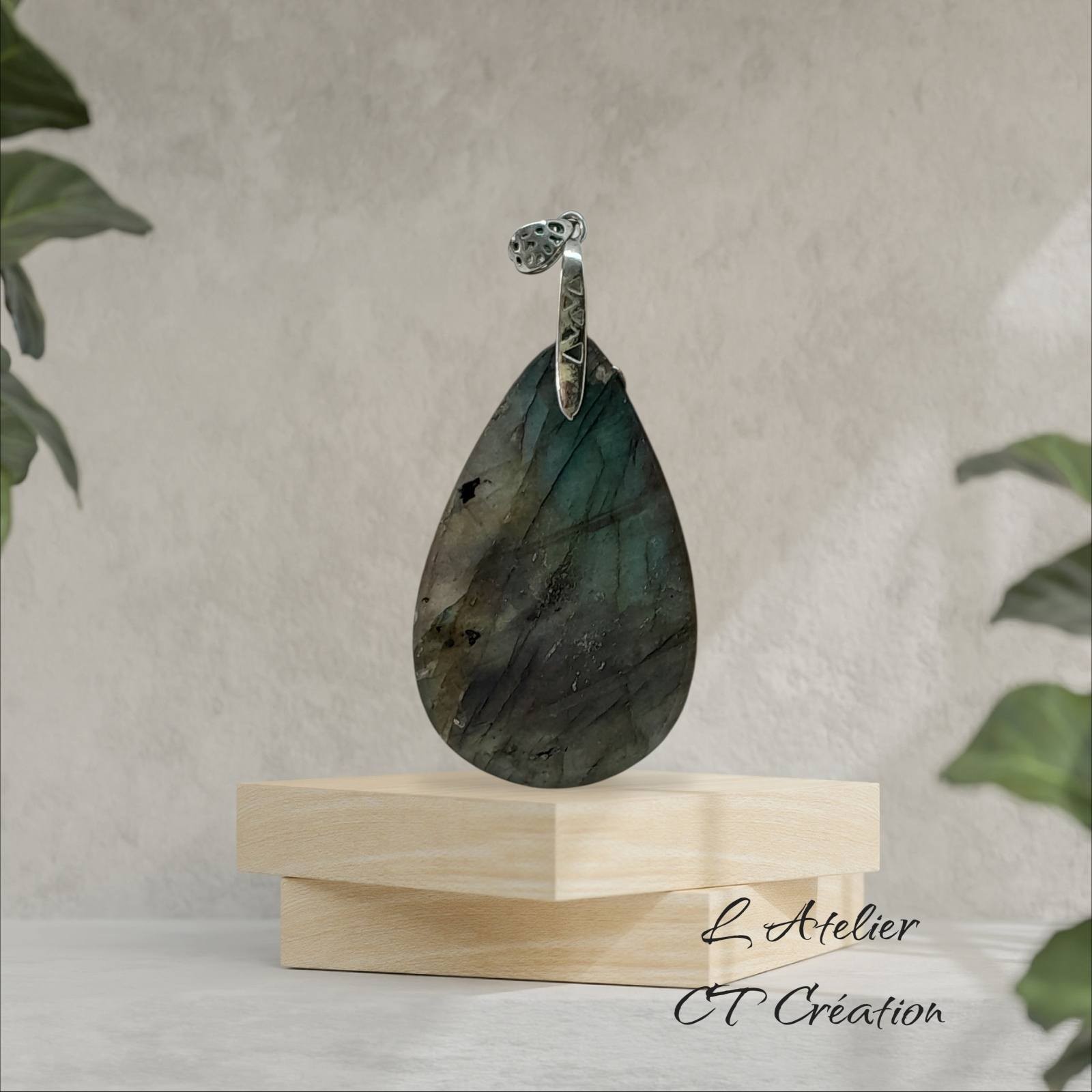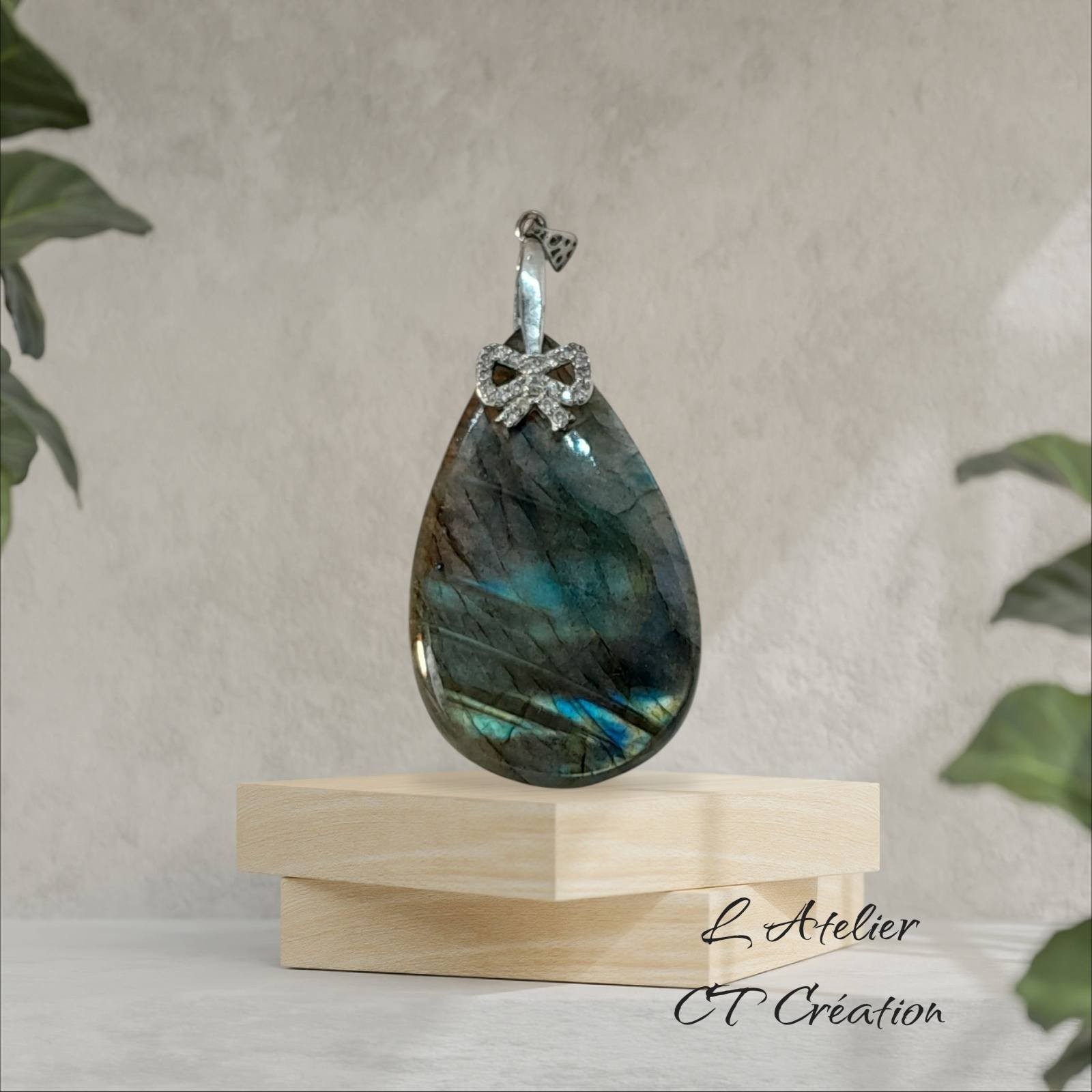Magnifique pièce de Labradorite forme goutte avec bélière Noeud papillon en zircons