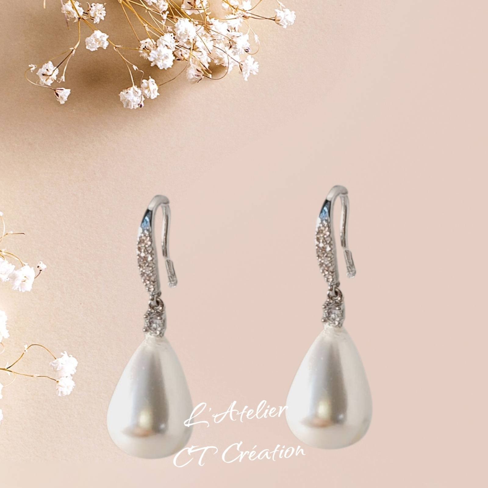 Magnifique Boucles d’Oreilles laiton et zircons avec pendentif Goutte en Coquille de nacre