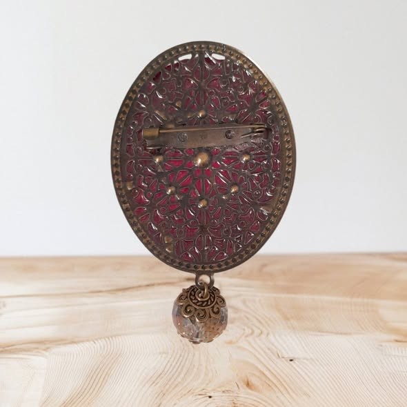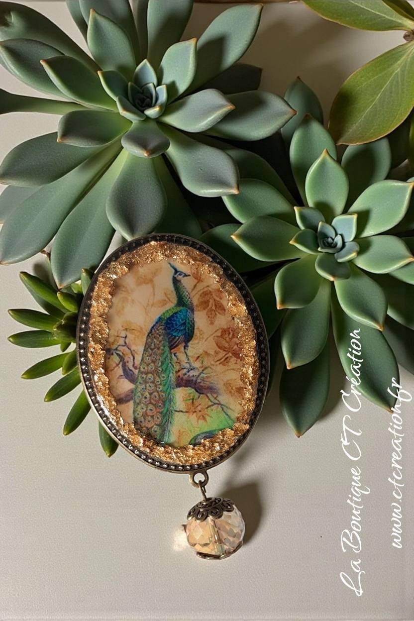 Cette pièce est réalisée sur une dentelle de métal travaillée avec un Cabochon réalisé en atelier à partir de résine, inclusions de feuille d'Or et une finition avec un pendentif de perle en Cristal à facettes