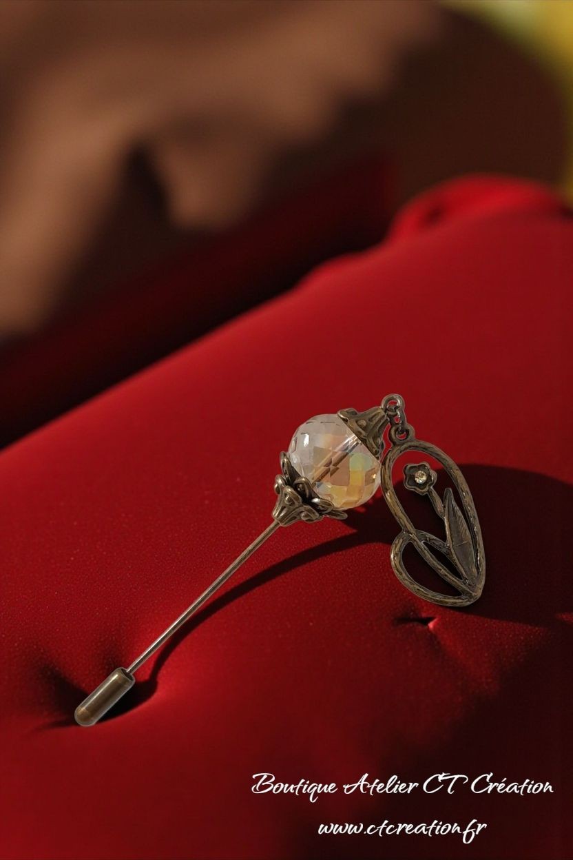 Magnifique Broche Fibule réalisé sur commande avec tige bronze, coupelles laiton bronze baroques et grosse perle rondelle facettes en cristal, pendentif fleur avec strass en cristal autrichien