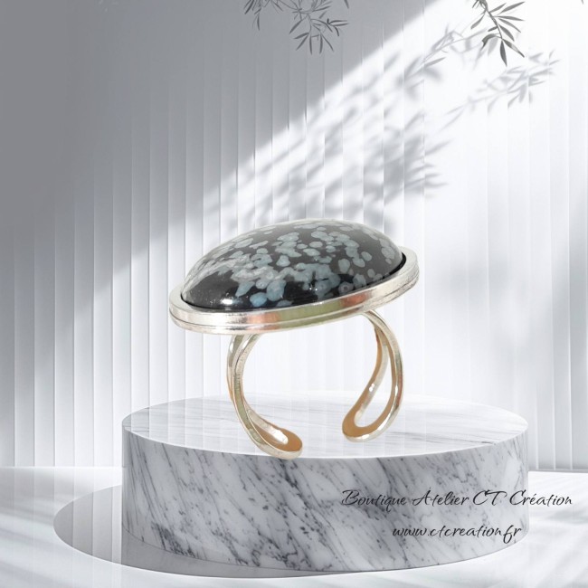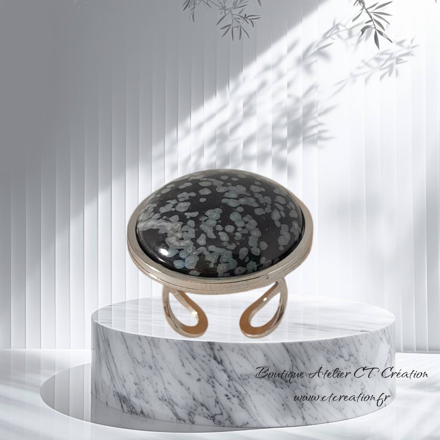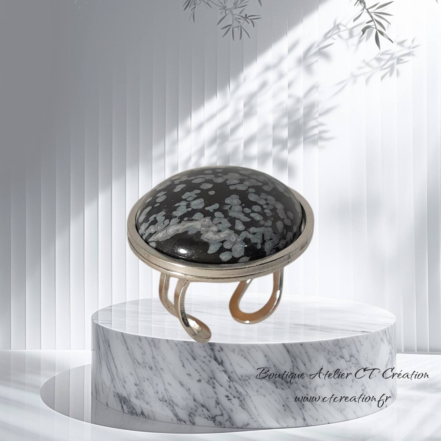 Magnifique Bague ronde XL avec Cabochon Obsidienne neige extra 25mm