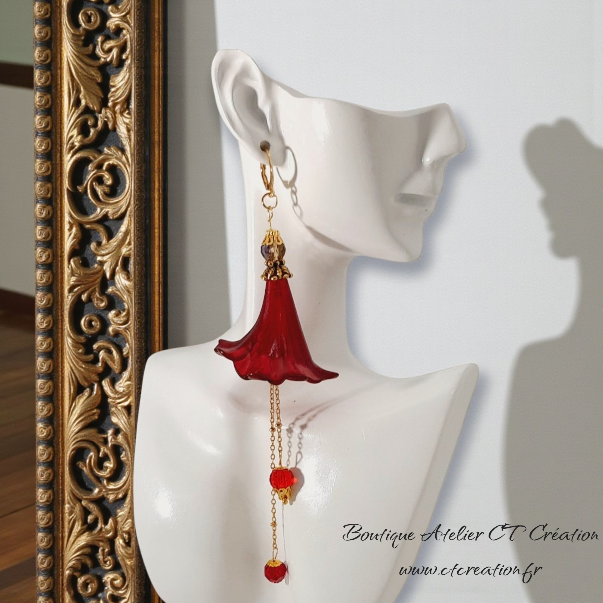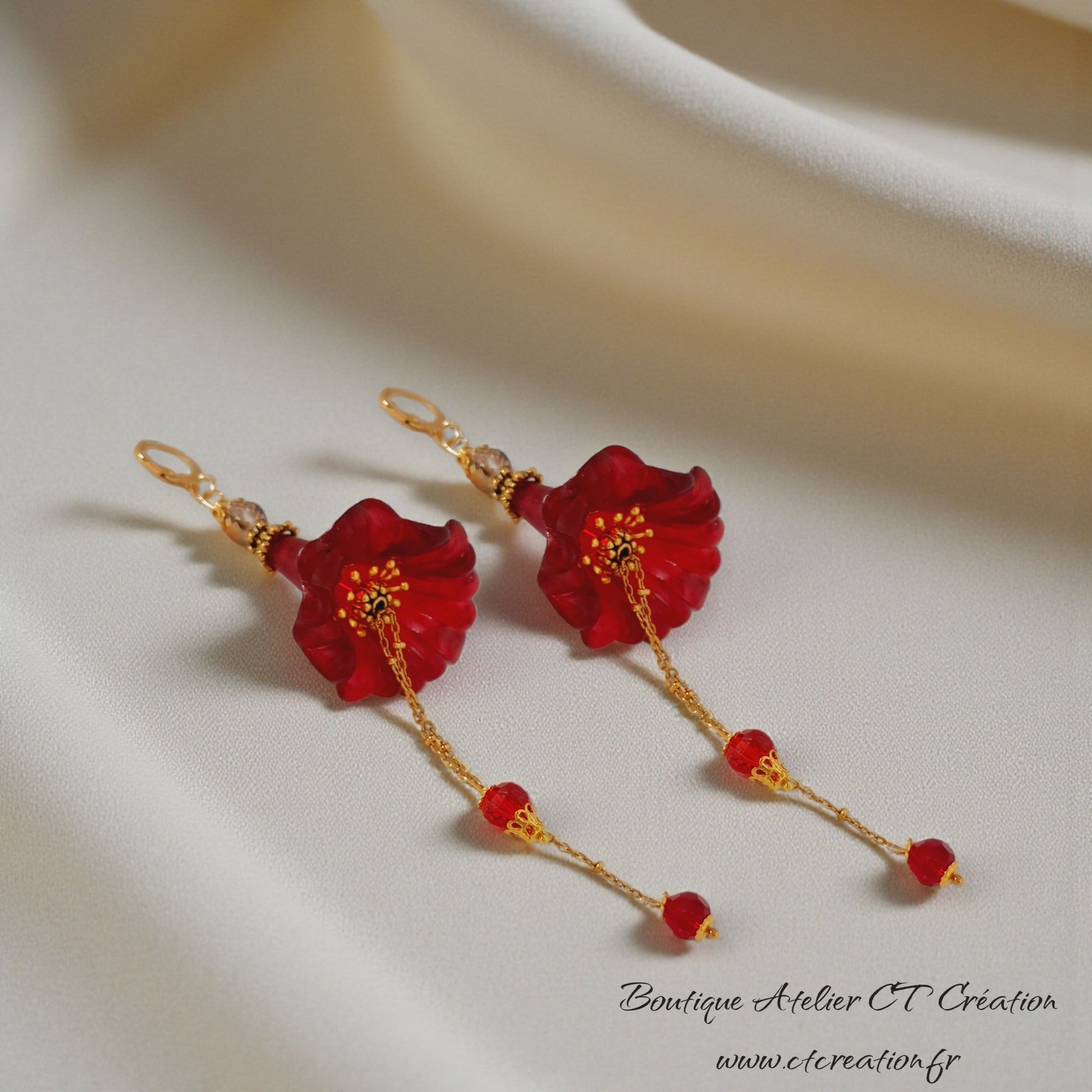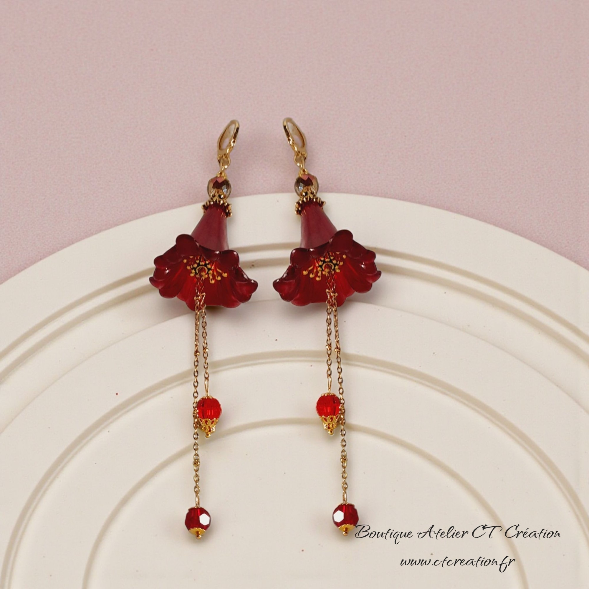 Leur grande fleur rouge profonde, délicatement sculptée, évoque un pétale en mouvement. Elle est sublimée par des éléments dorés finement travaillés et par deux petites perles rouges à facettes uspendues à de fines chaînes, apportant une touche de légèreté et de sophistication.