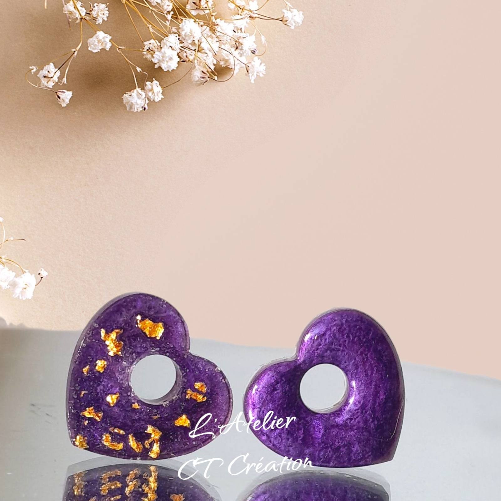 2 superbes pampilles petits Coeurs réversibles réalisées entièrement en Atelier à partir de résine et pigments naturels et feuille d'Or
