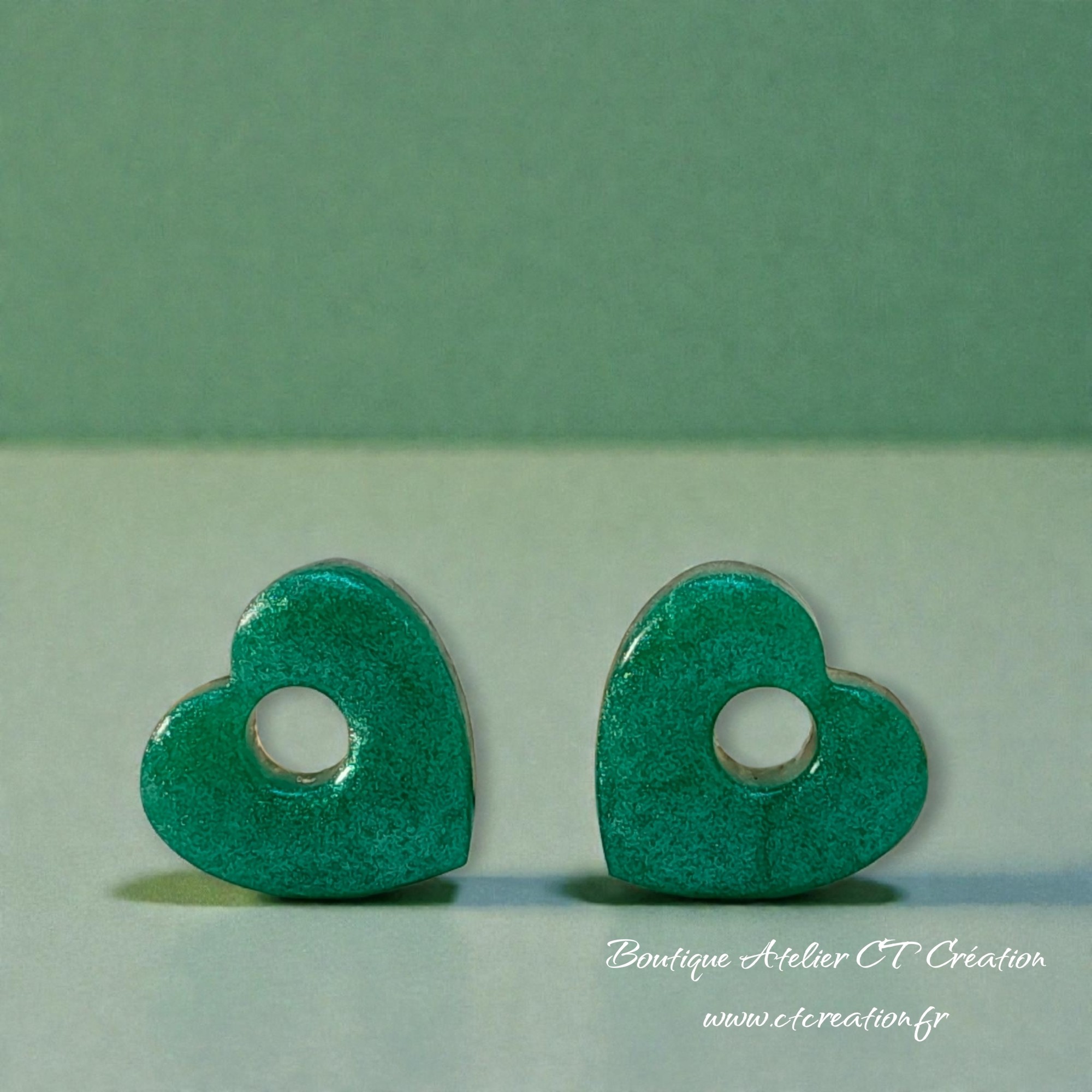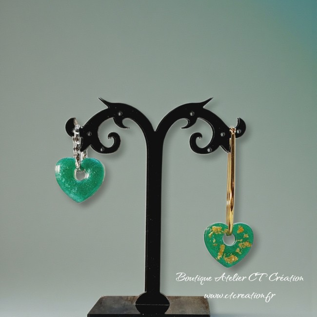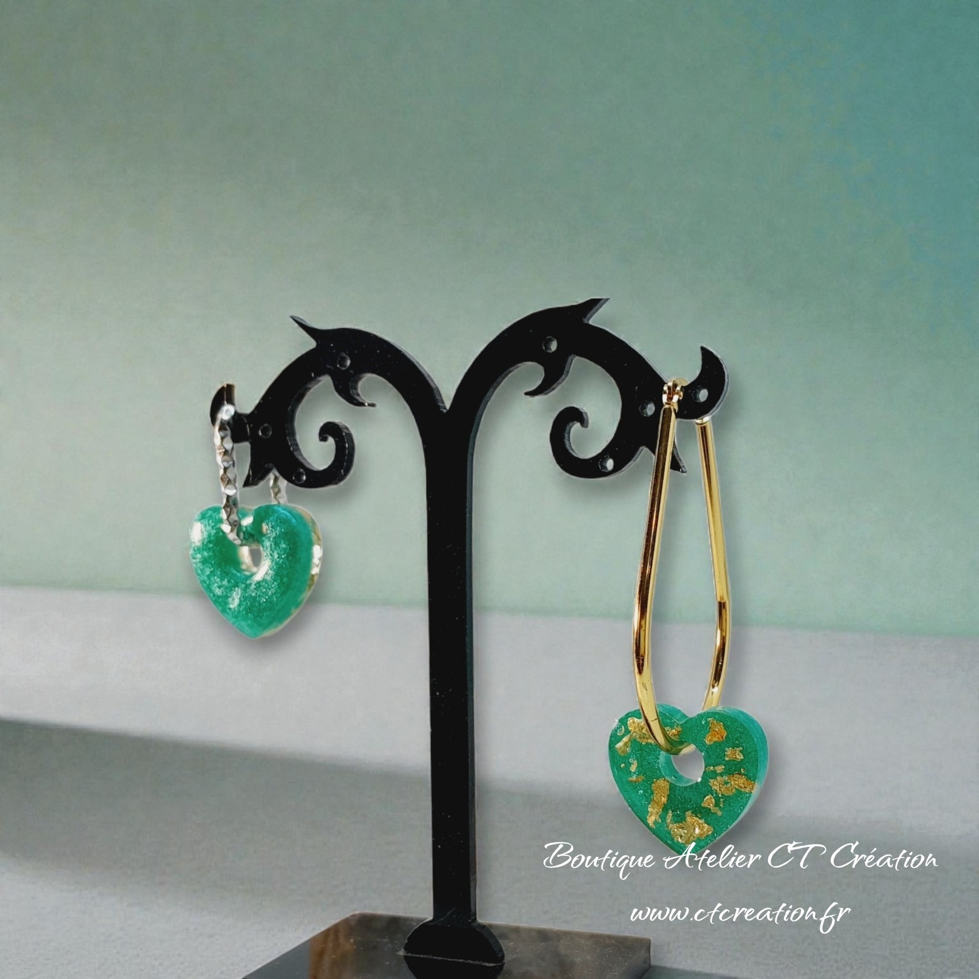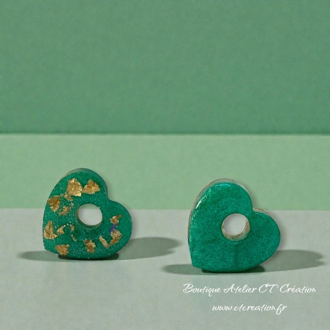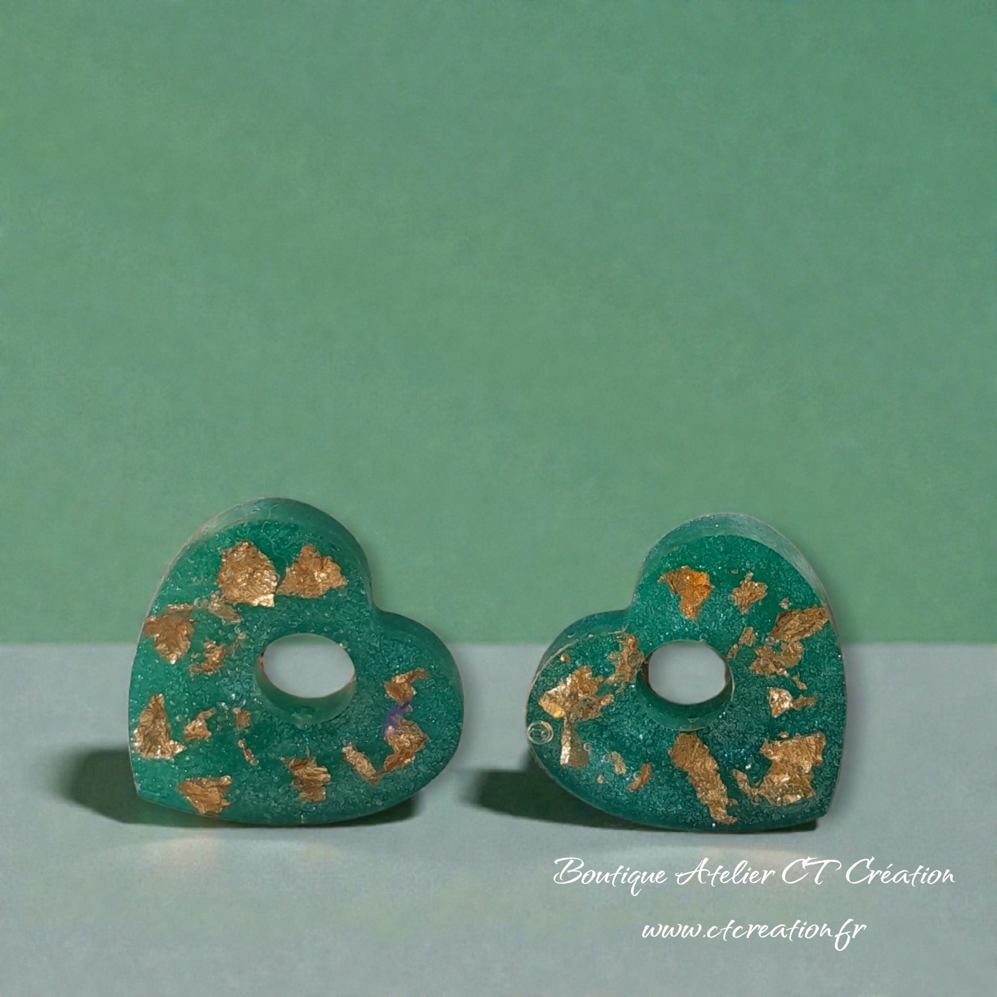 2 superbes pampilles petits Coeurs réversibles réalisées entièrement en Atelier à partir de résine et pigments naturels et feuille d'Or