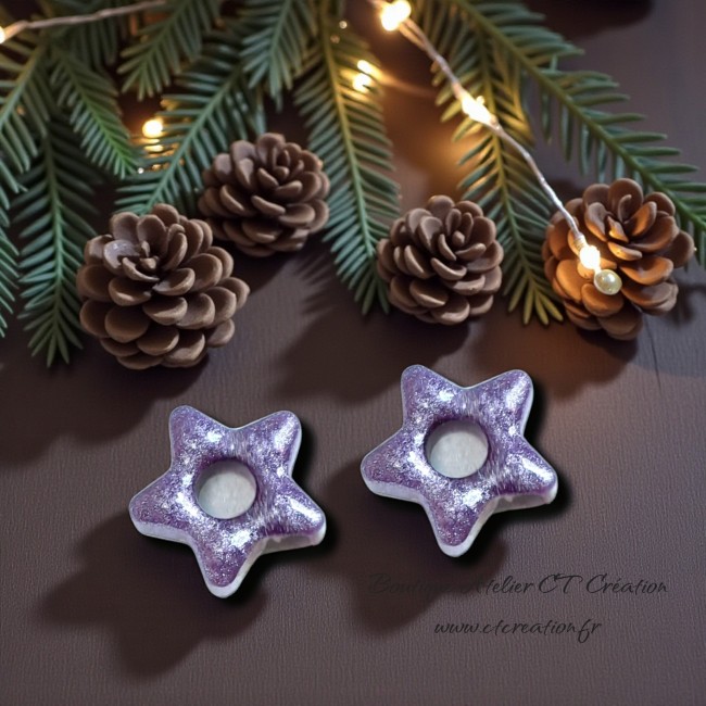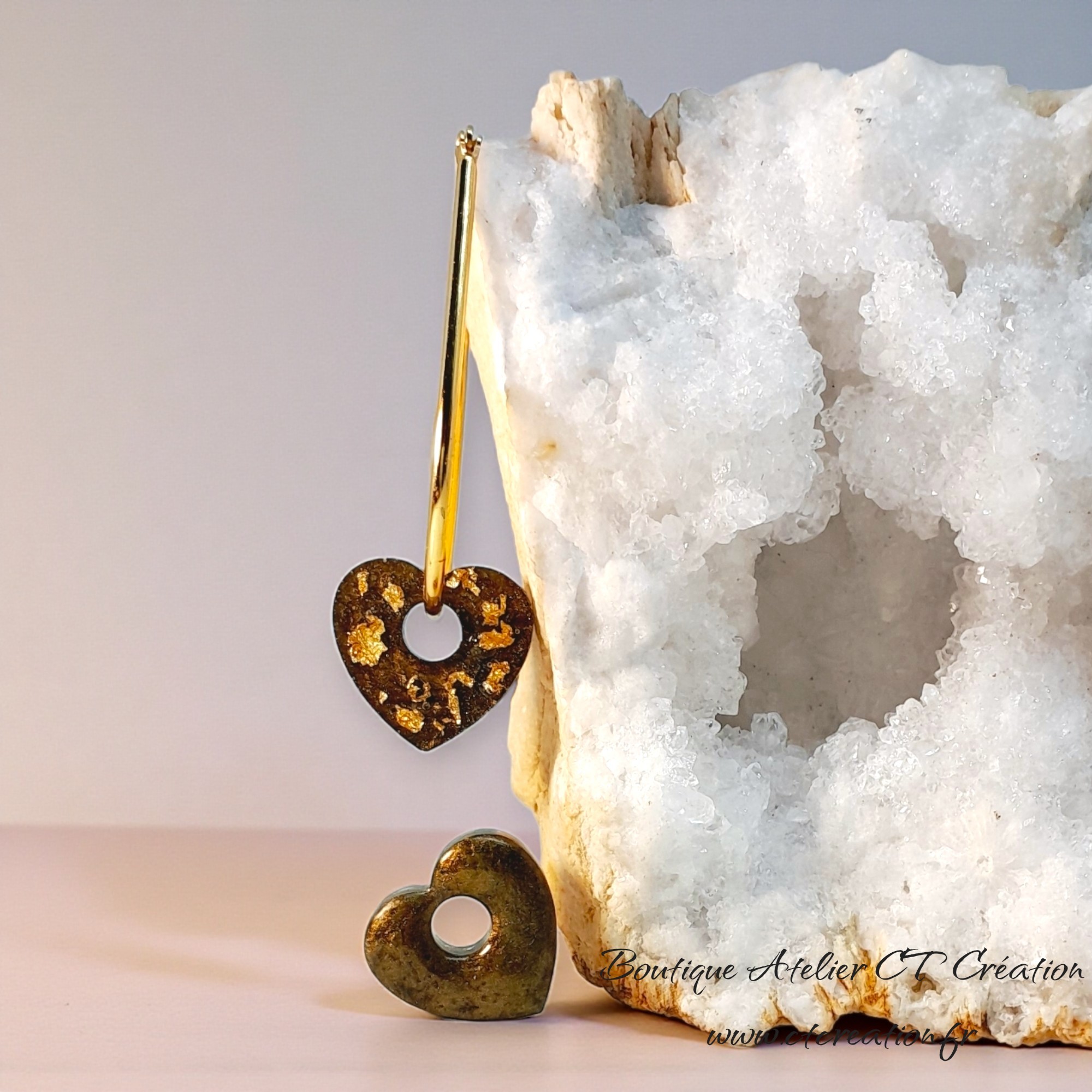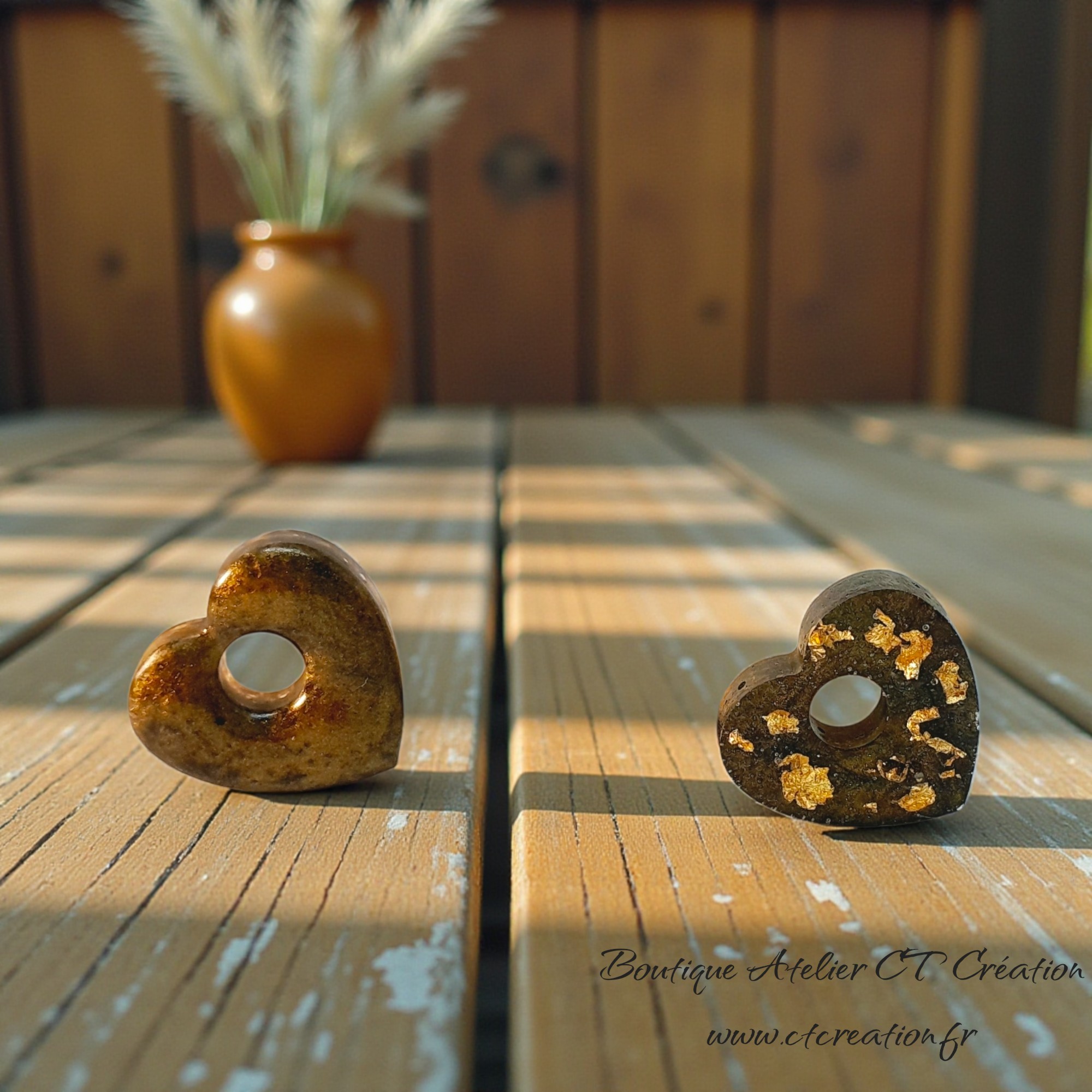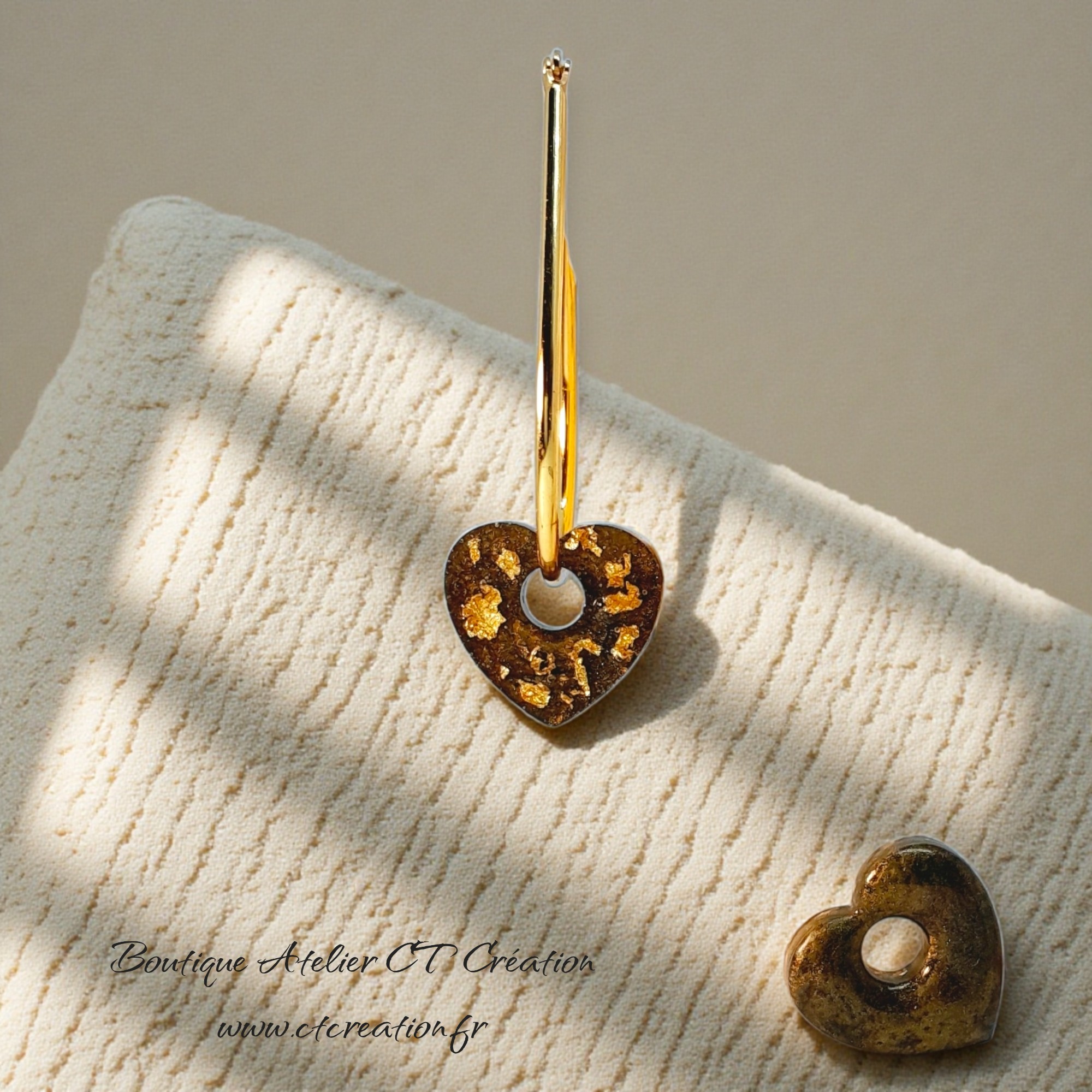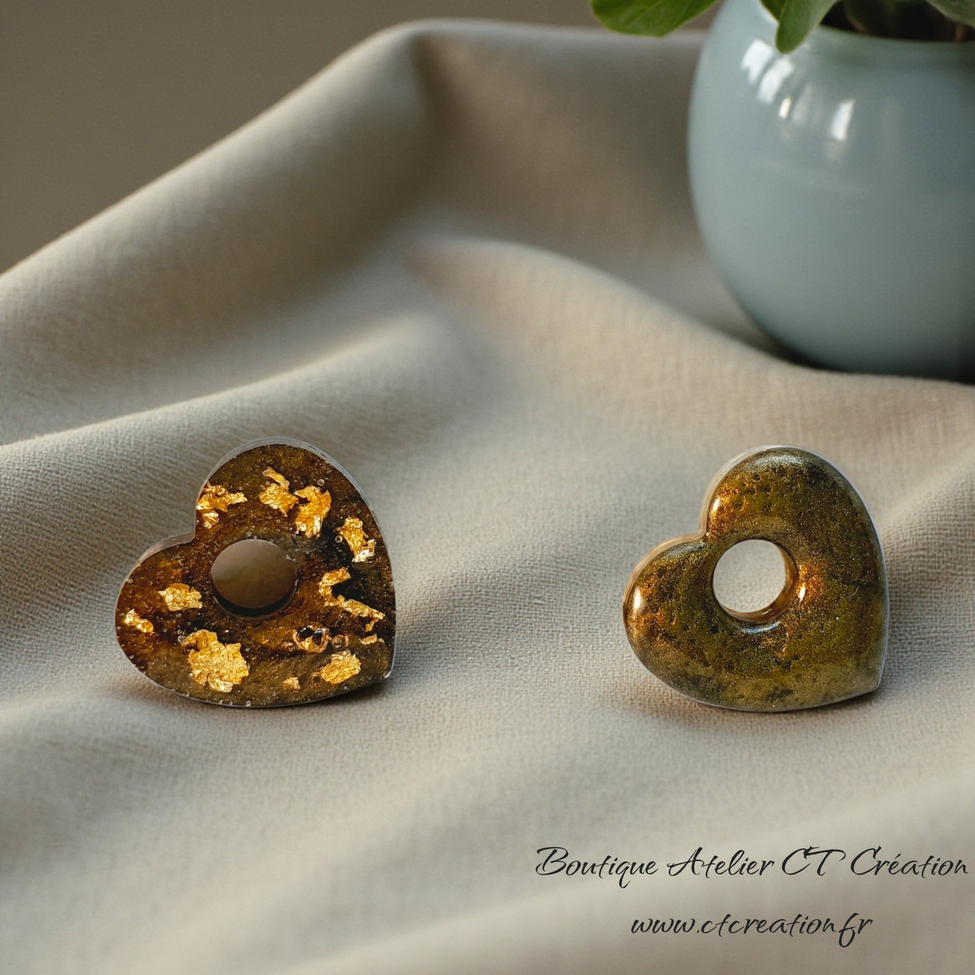2 superbes pampilles petits Coeurs réversibles réalisées entièrement en Atelier à partir de résine et pigments naturels et feuille d'Or