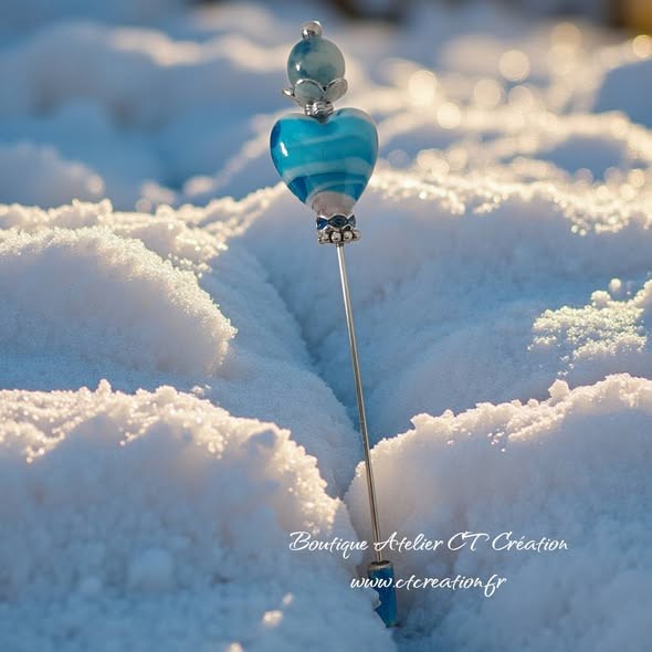 Ajoutez une touche d’élégance artisanale à vos créations ou à vos tenues grâce à cette magnifique épingle décorative faite main. Elle est ornée d’un cœur en verre Murano bleu, aux nuances délicates de blanc et de turquoise, ainsi que d’une perle ronde assortie offrant un joli dégradé bleu nuageux.