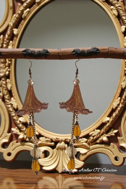 Tiges en laiton bronze, perles en cristal & verre, pendentifs lucite résinés et teintés en atelier