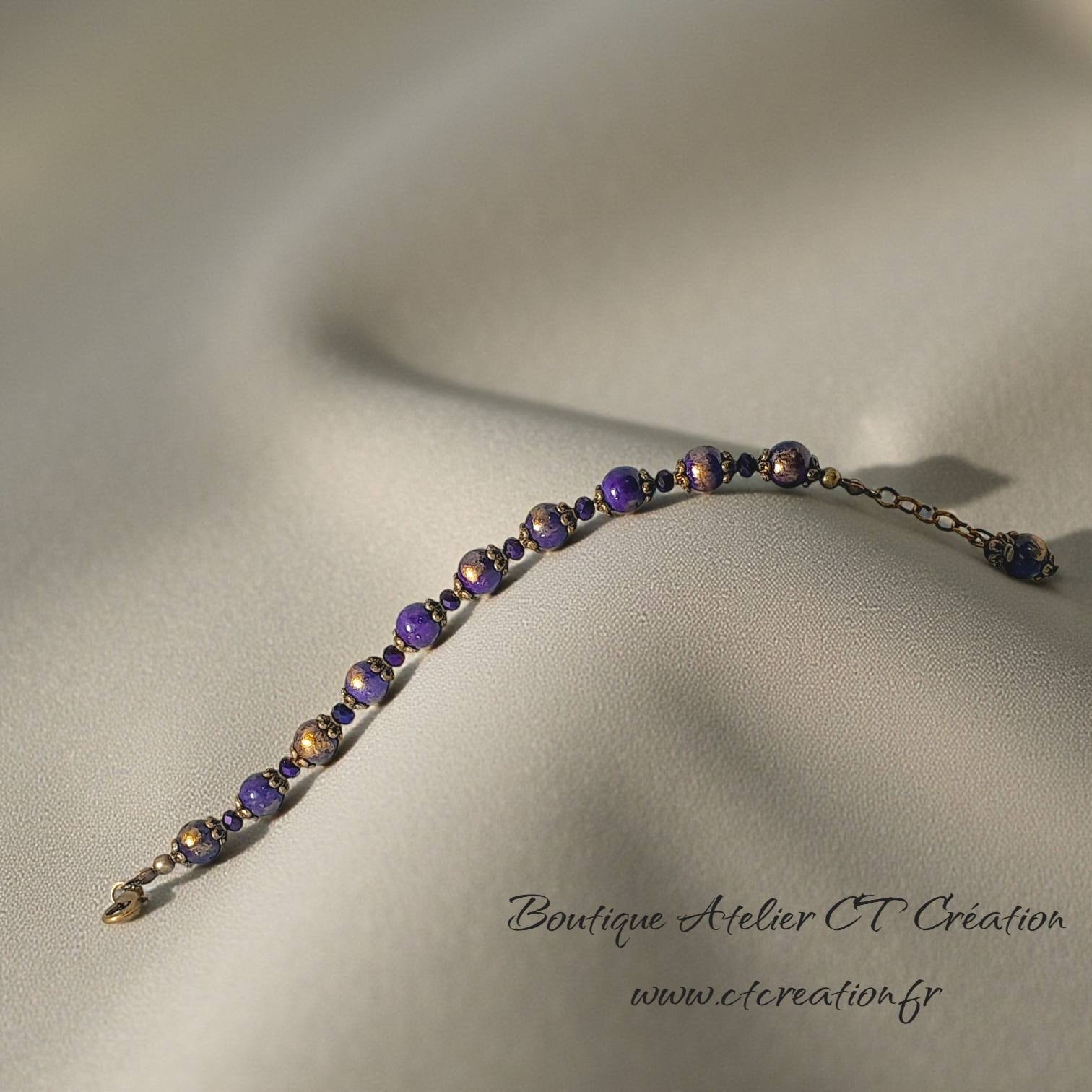 Bracelet réalisé avec des perles en jade mashan violet poudre d'or (8mm), intercalées de perles en verre à facette et de coupelles florales en bronze