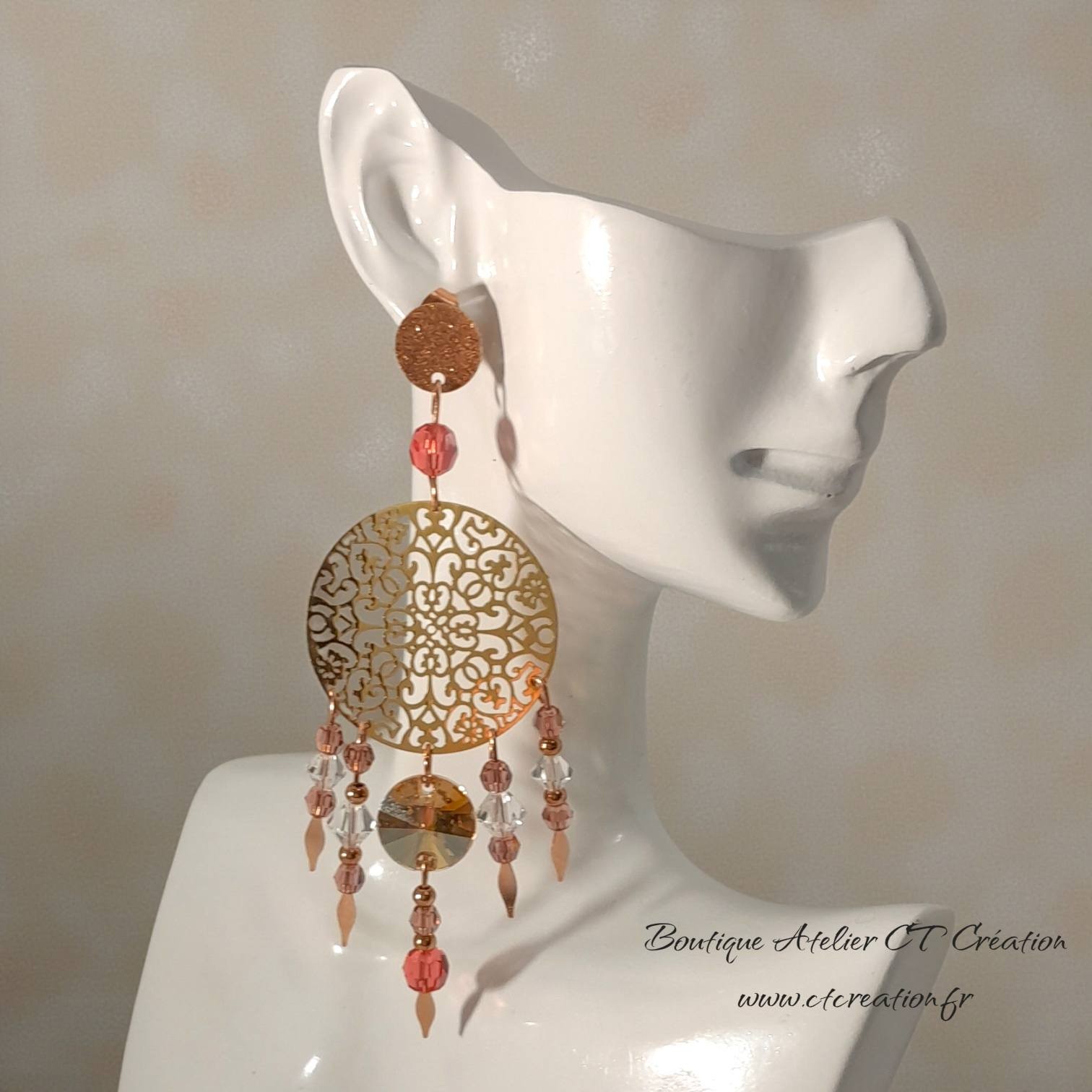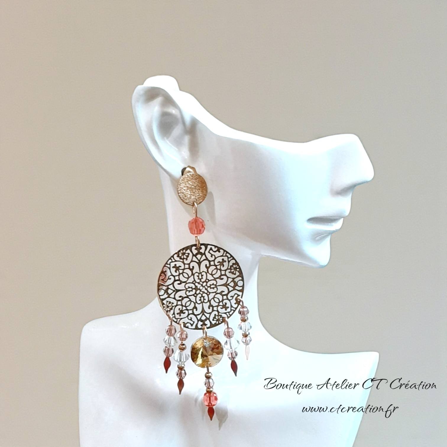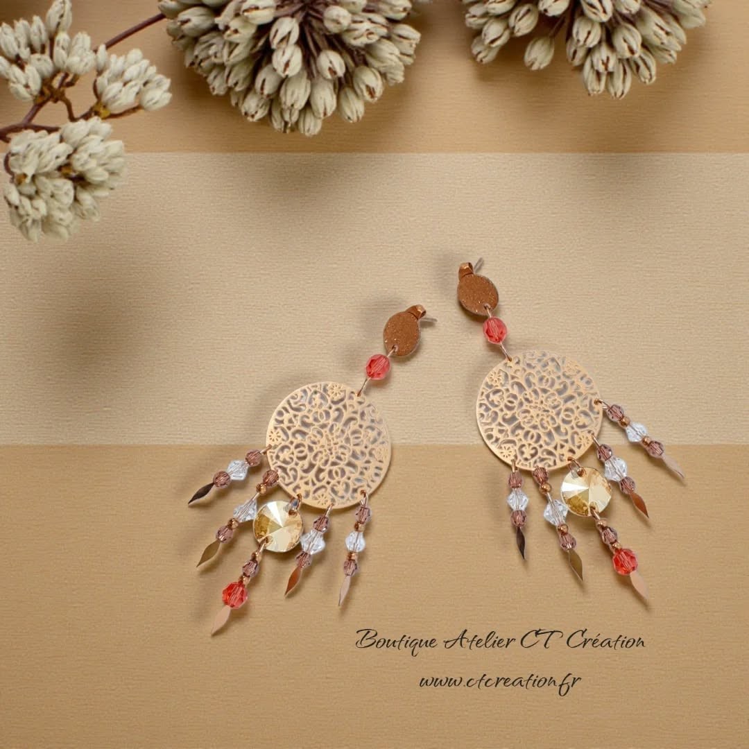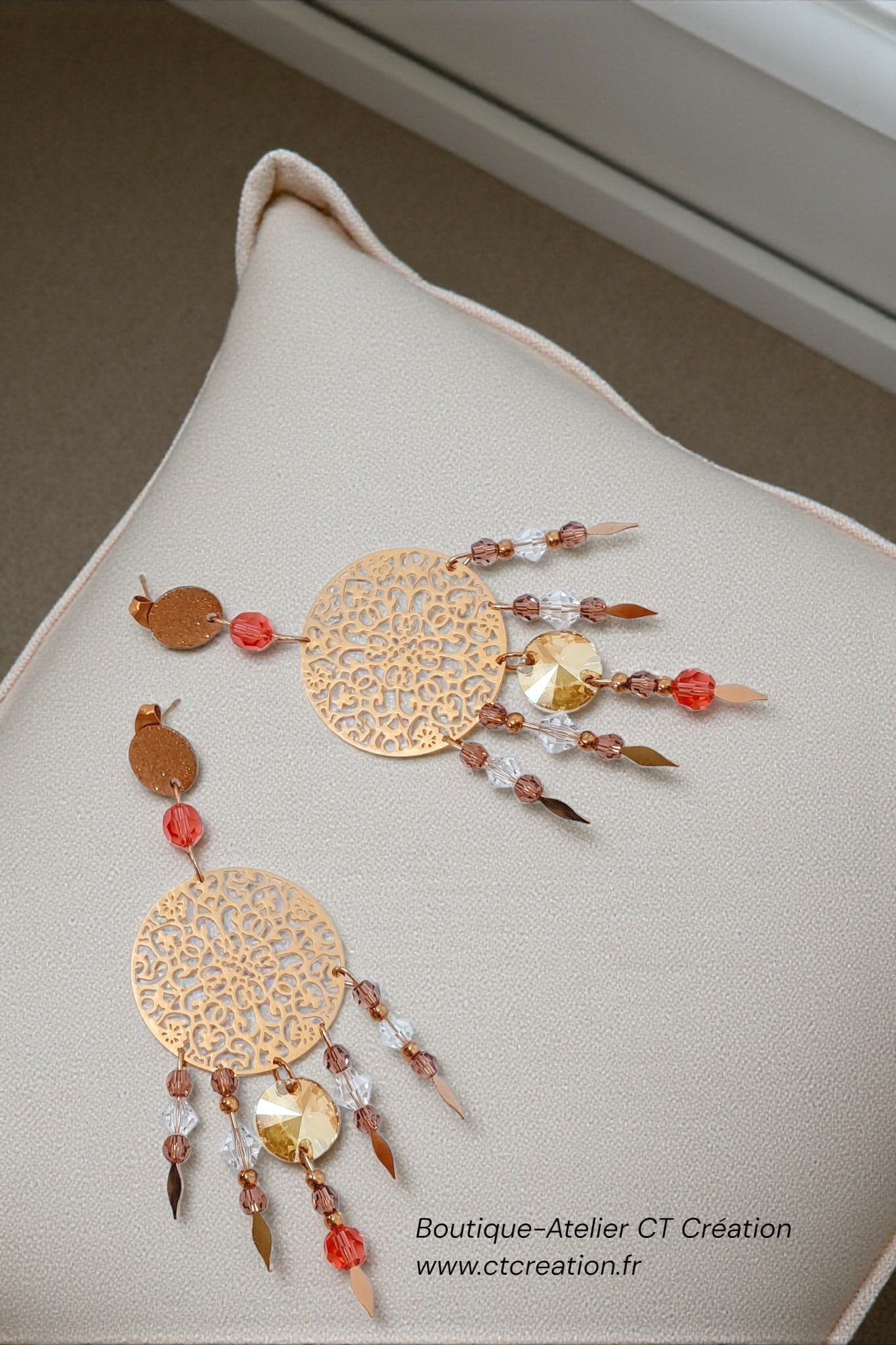 Leur design mandala finement ajouré, associé à des perles en Cristal Autrichien dans des tons rosés et dorés, apporte une touche bohème chic irrésistible.