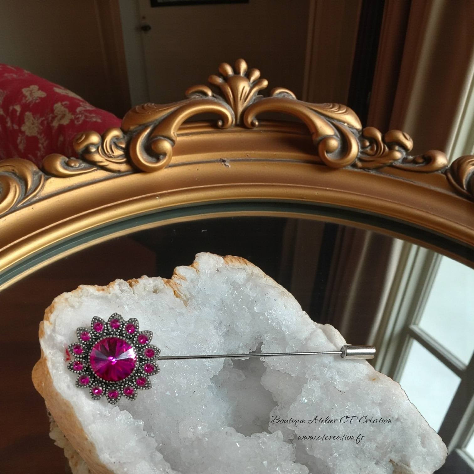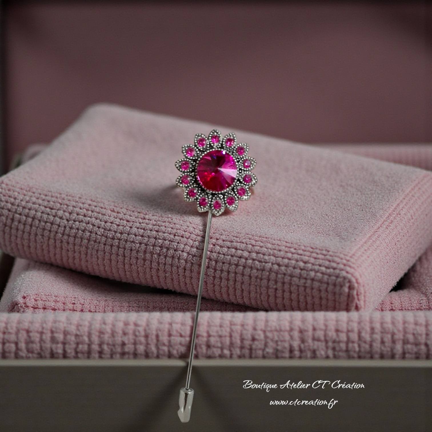 Au centre, un large cristal autrichien facetté rose fuchsia de 10mm qui capte la lumière avec éclat, sublimé par un entourage de petits strass en Cristal rose finement sertis.
