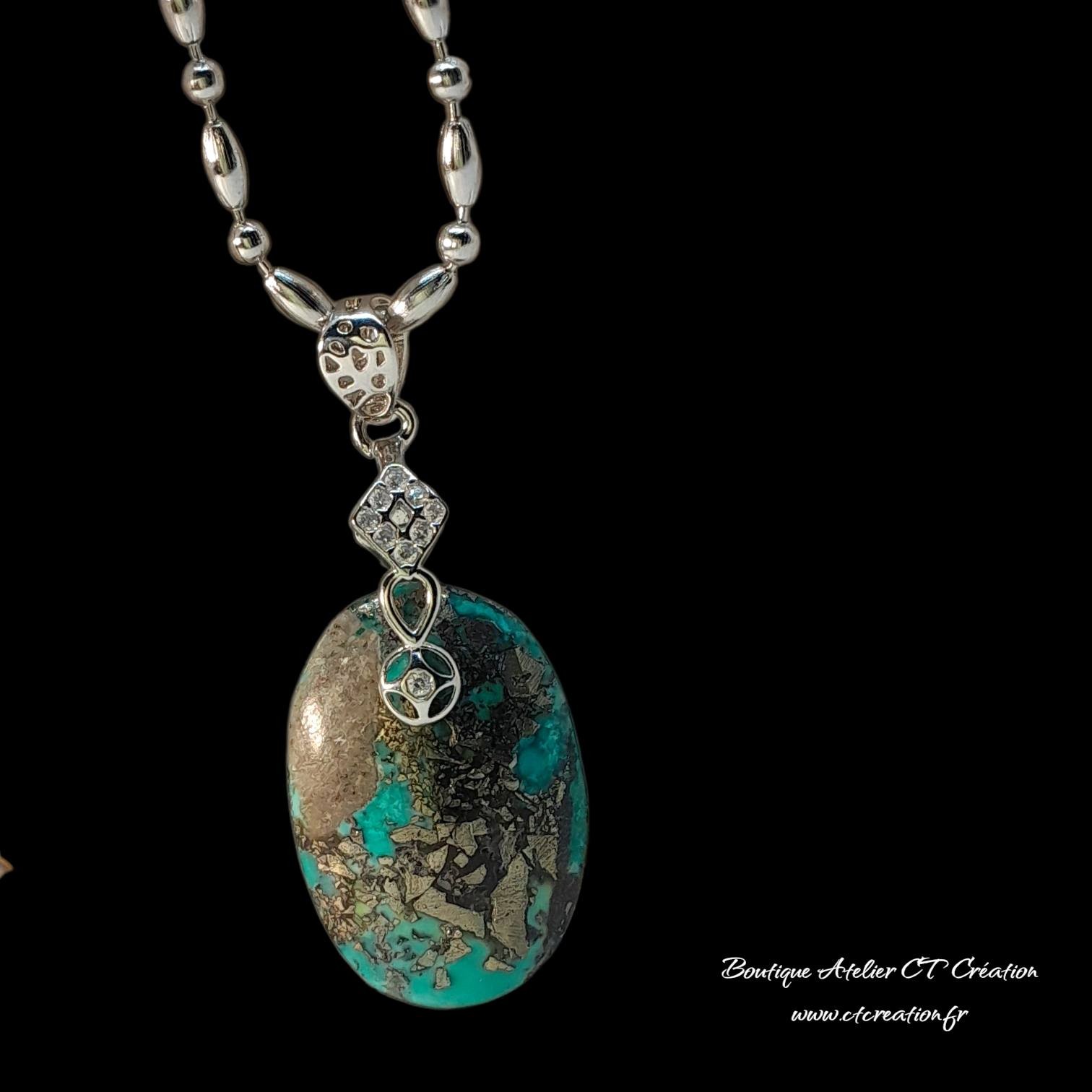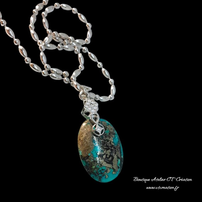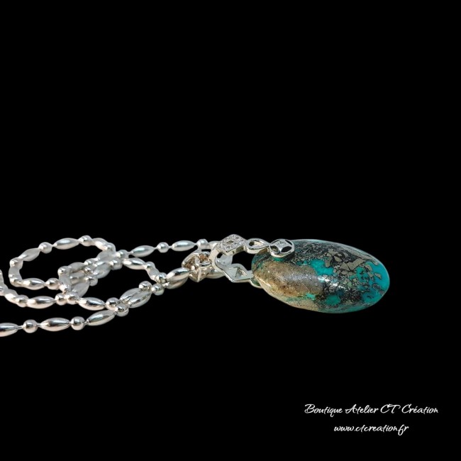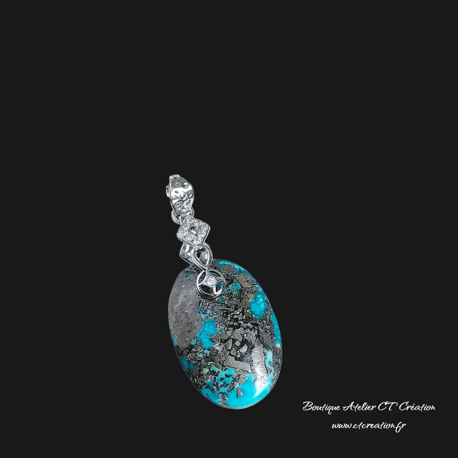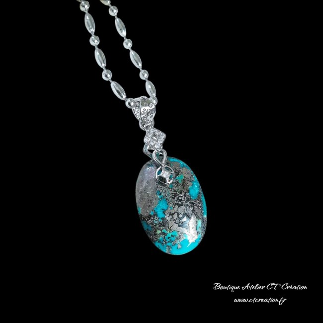 La turquoise de l’Utah est une pierre naturelle rare et authentique, appréciée pour ses teintes allant du bleu turquoise intense au vert profond, souvent mêlées à une matrice brun-noir ou cuivrée. Cette matrice, parfois marbrée ou veinée, confère à chaque pierre un caractère unique et une esthétique minérale très recherchée