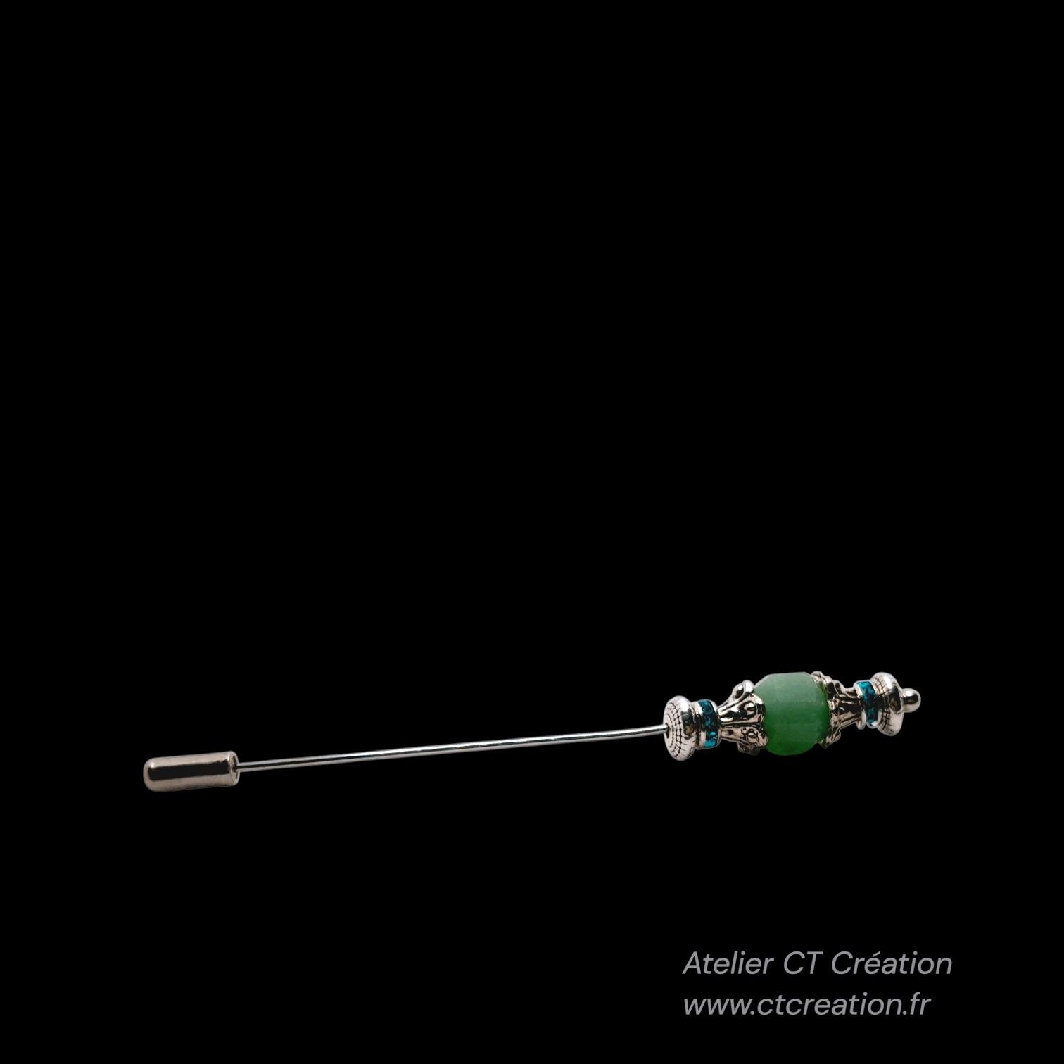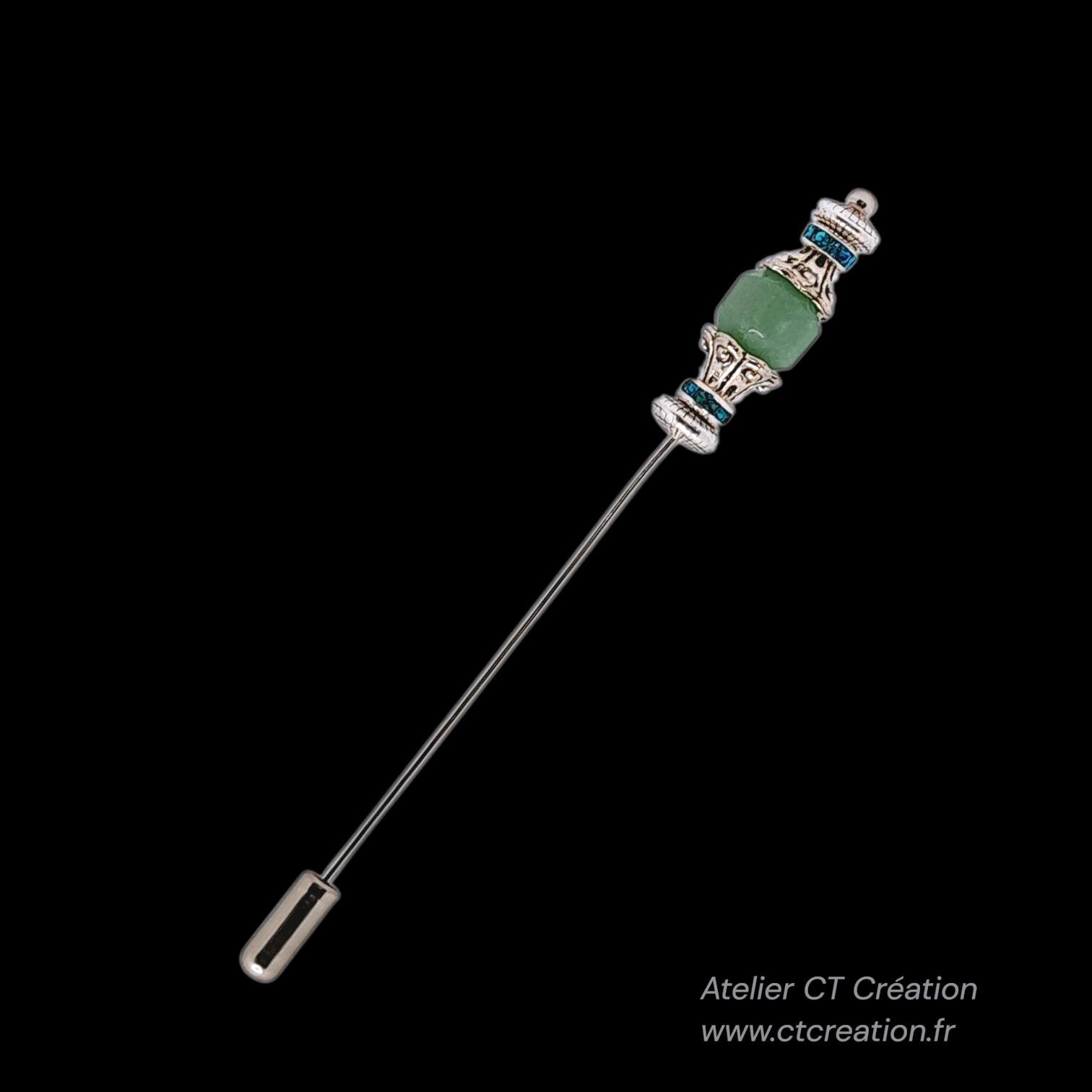 Apportez une touche d’élégance et de raffinement à vos tenues avec cette superbe fibule réalisée avec une perle d'Aventurine Verte 10mm de forme octogonale, ornée de perles rondelles strass en cristal turquoise, coupelles inspirée d'un style vintage baroque