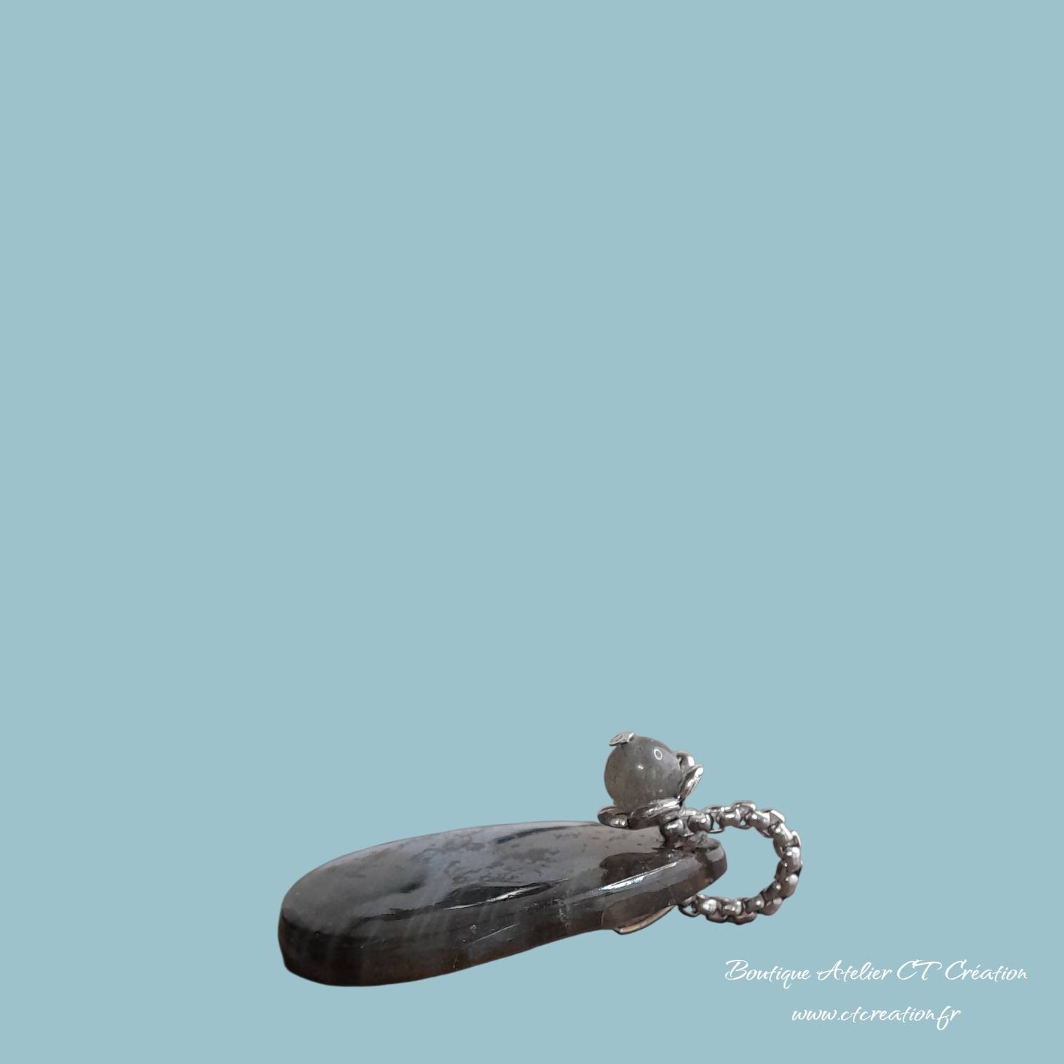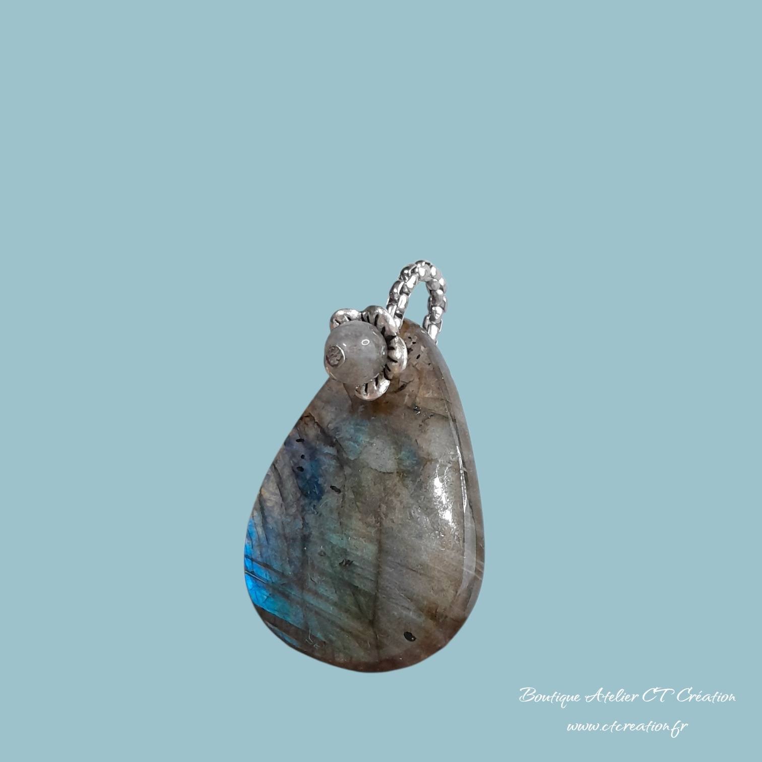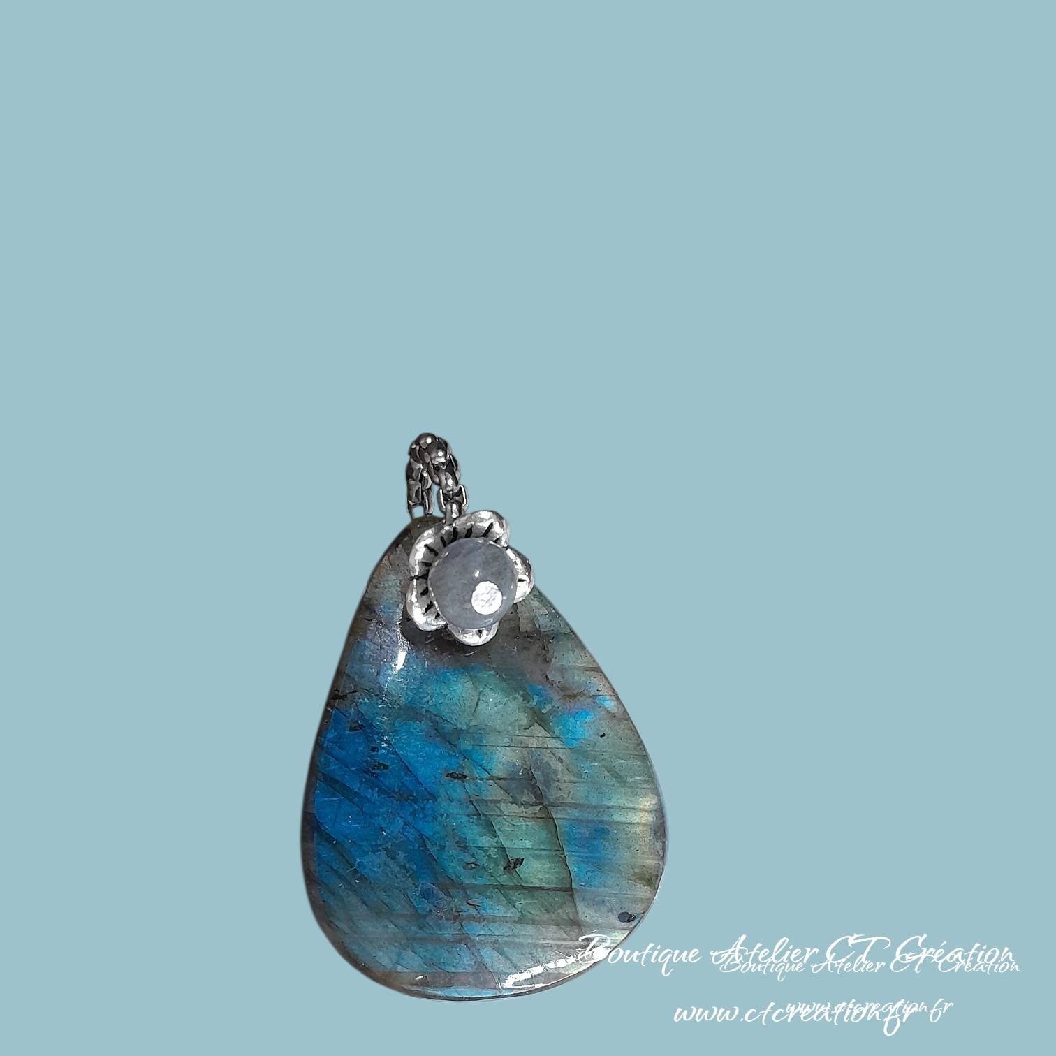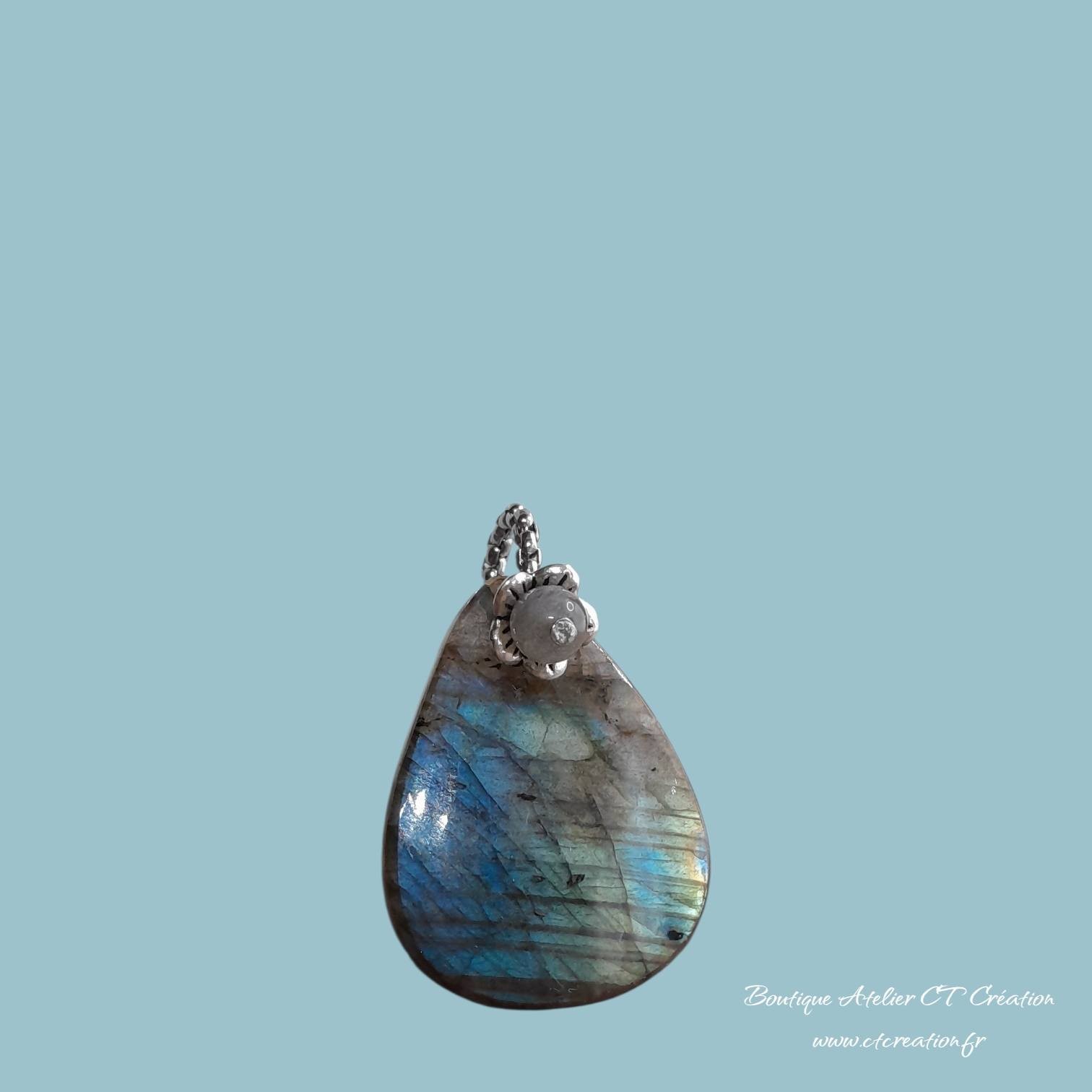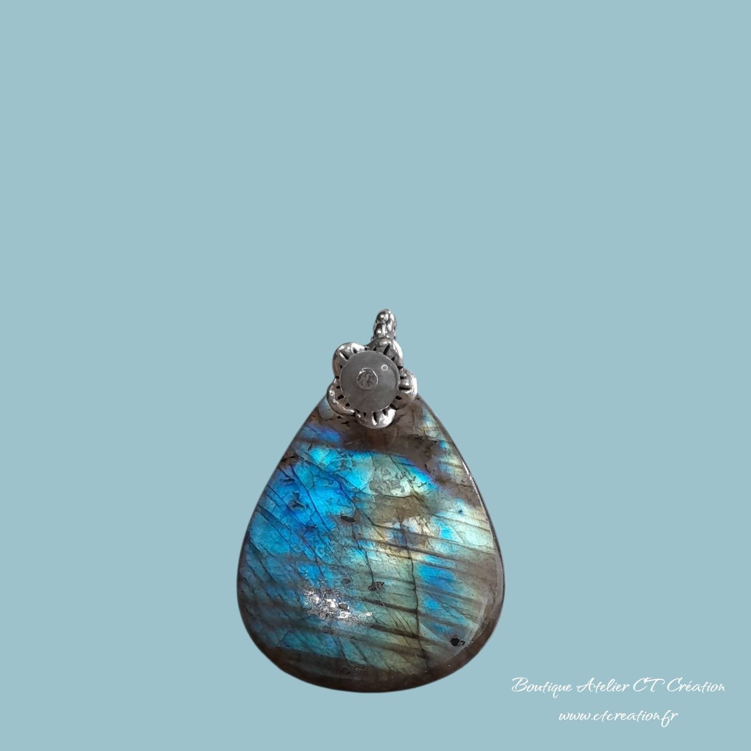 Magnifique pièce de Labradorite forme goutte avec une bélière réalisée en atelier perle Labradorite 6mm et coupelle florale