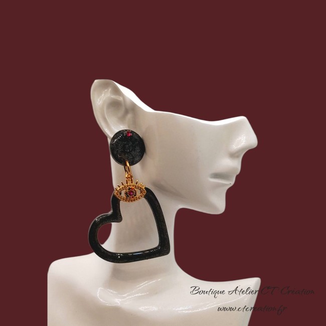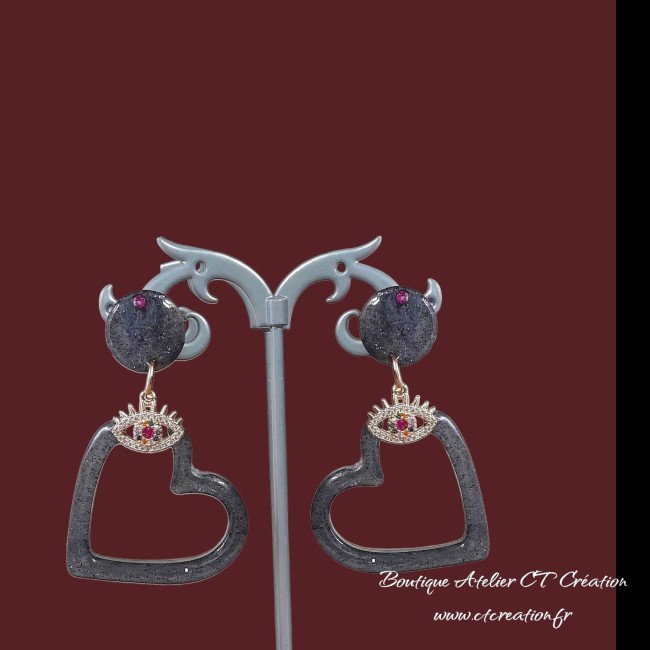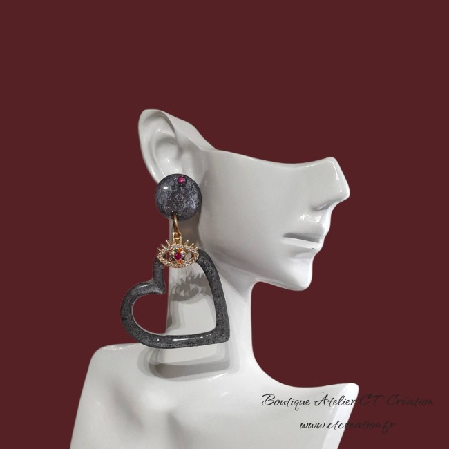 Superbes boucles d'oreilles très légères car elles sont réalisées à partir de résine et pigments avec intercalaire oeil de protection en laiton incrusté de zircons