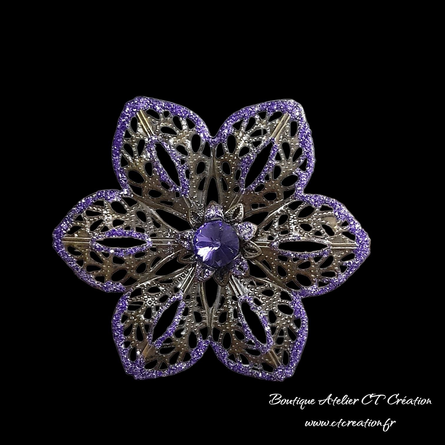 Ses pétales en dentelle de métal bronze offrent un jeu de lumière délicat, tandis que son cœur est orné d’un magnifique pcristal autrichien parme de 8mm incrusté dans une coupelle bronze, apportant éclat et élégance.