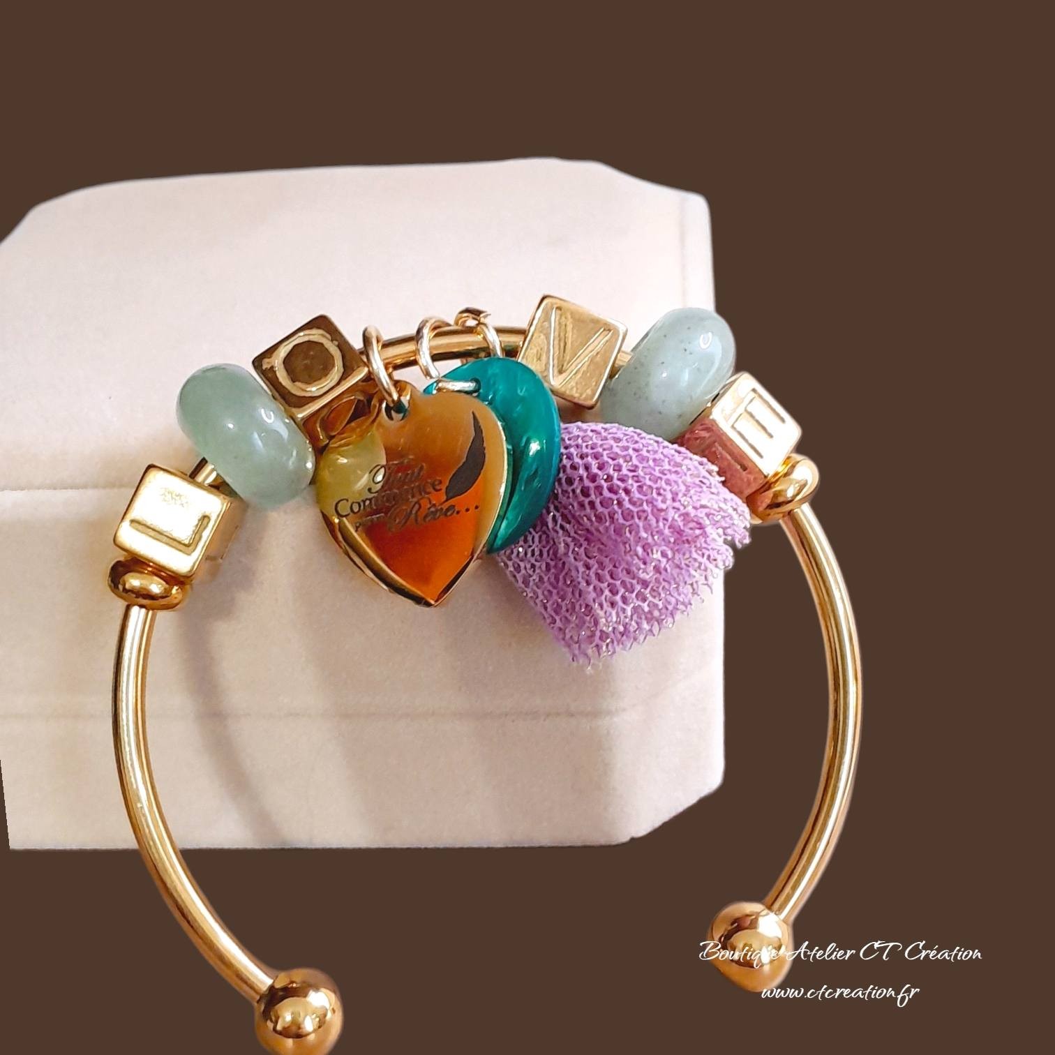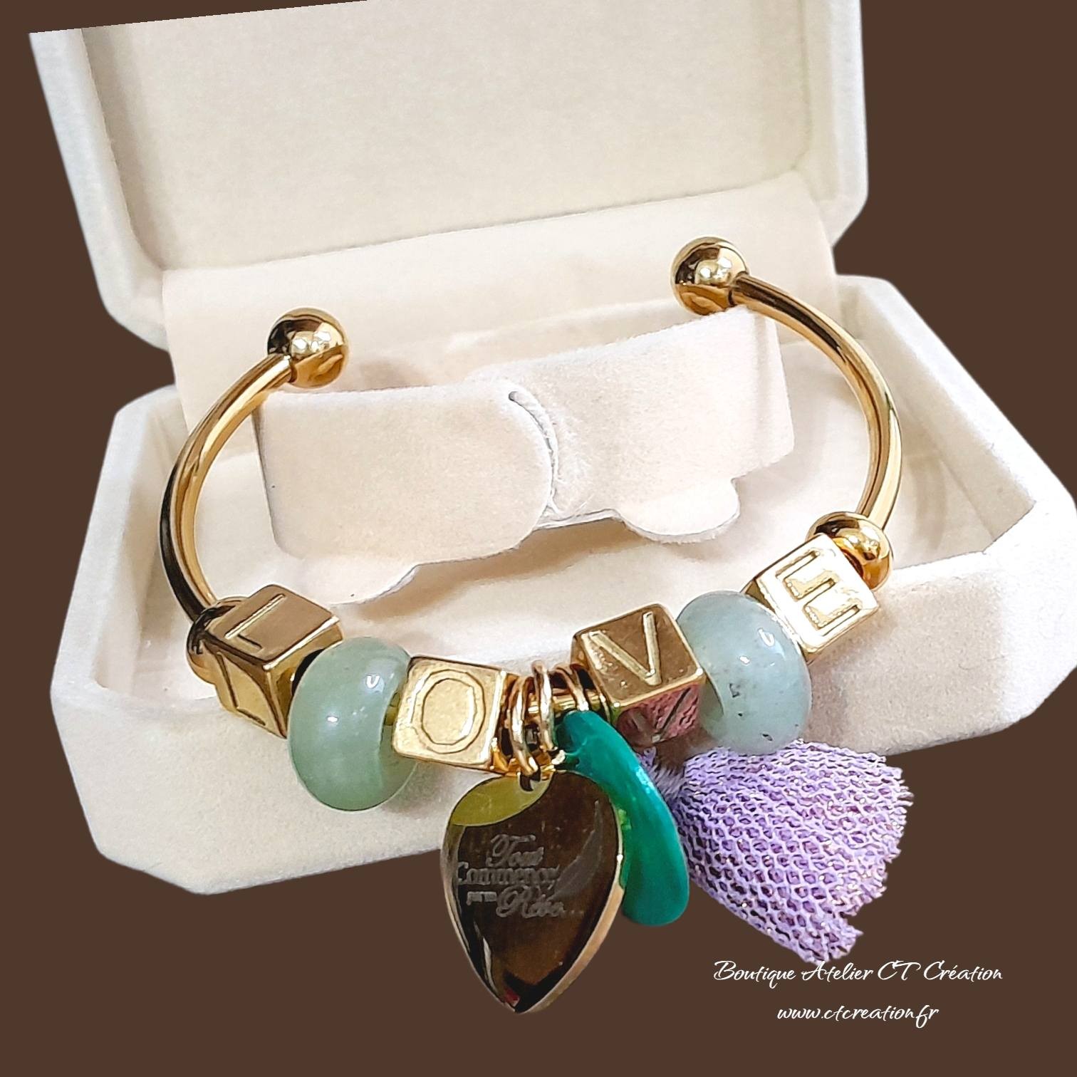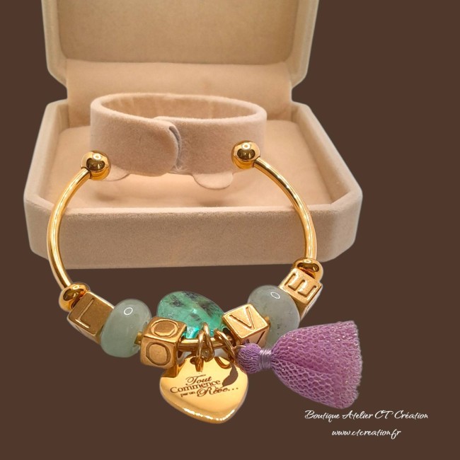 Bracelet jonc ouvert doré, orné de perles à gros trous en acier message LOVE, conçu comme un bijou poétique et symbolique.