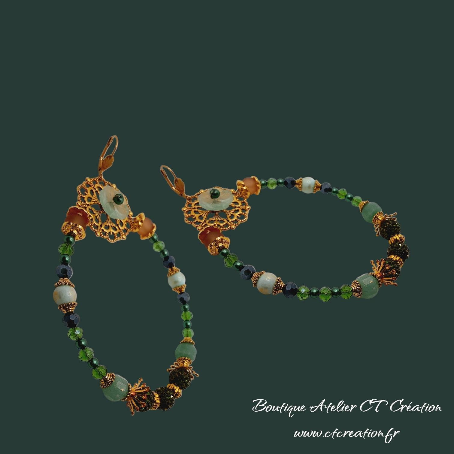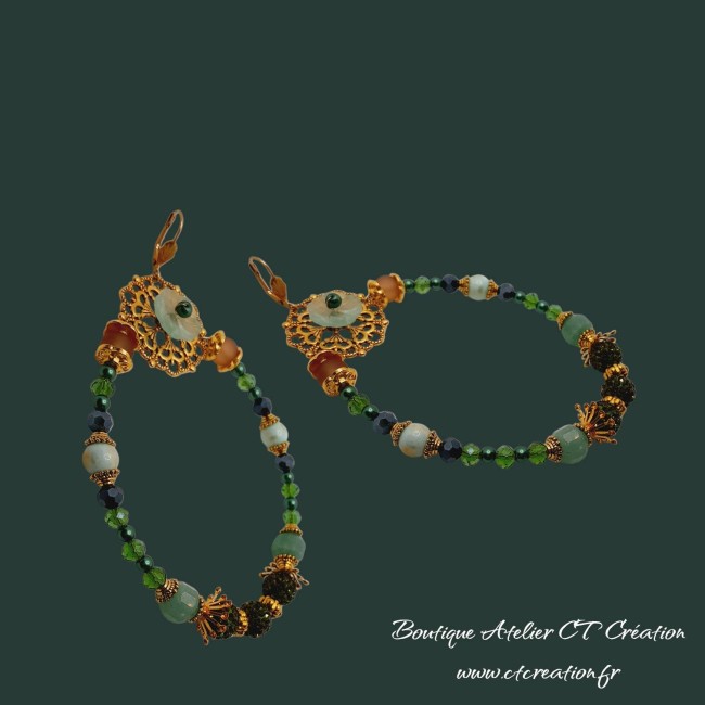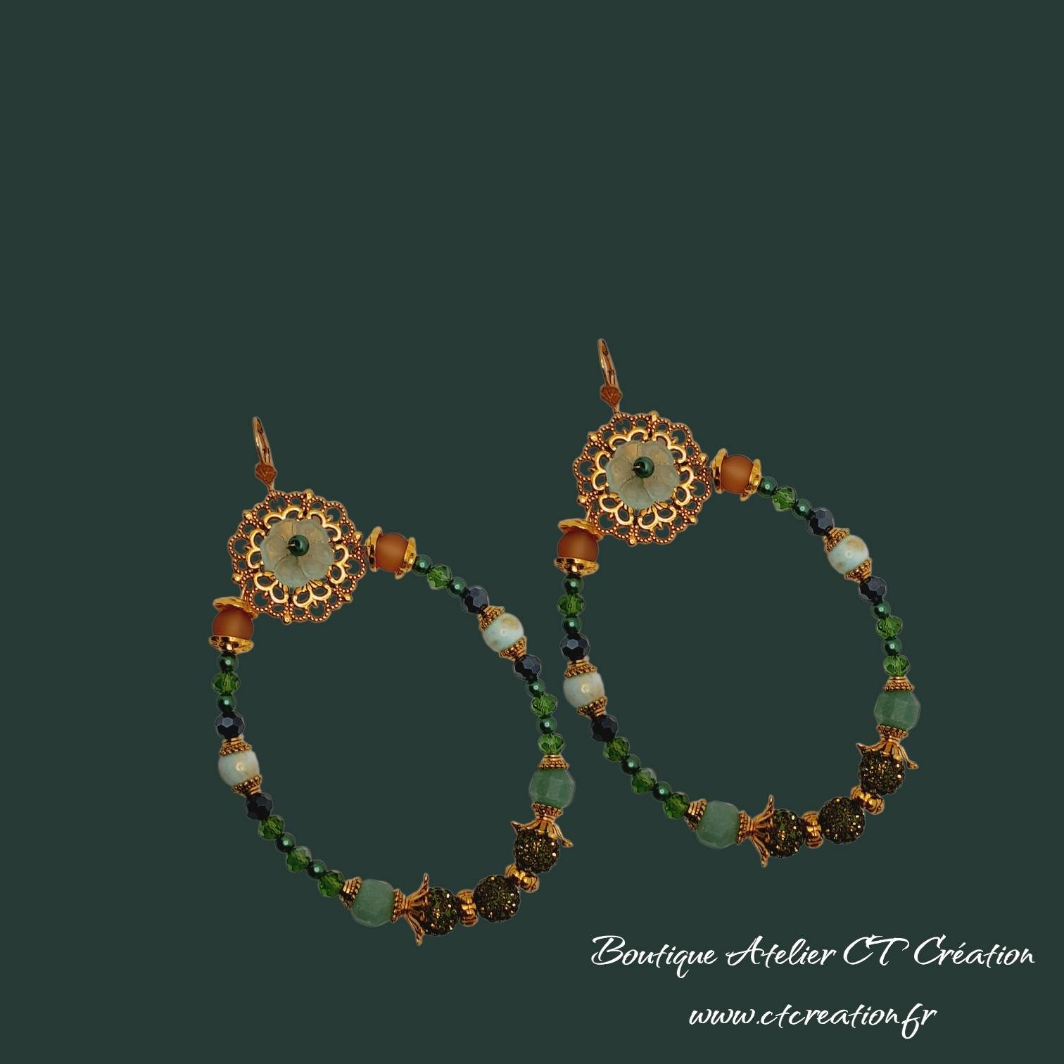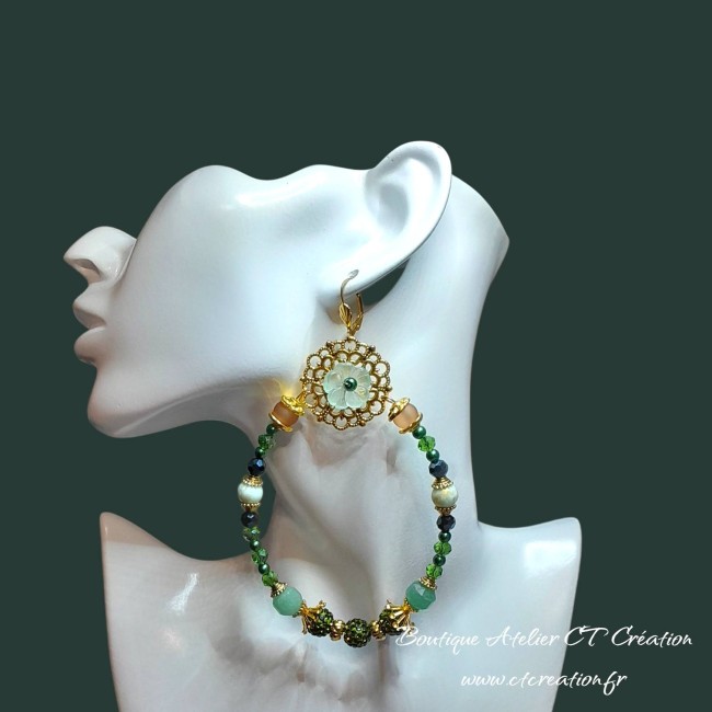 ✨ Apportez une touche d’élégance naturelle à votre style avec ces créoles vertes bohème chic, un bijou artisanal raffiné, entièrement réalisé à la main dans mon atelier.Ces boucles d’oreilles associent la délicatesse de perles en verre soigneusement sélectionnées à la beauté authentique de pierres naturelles, aux nuances vertes profondes inspirées de la nature. Le motif floral doré sublimé par une fleur en verre tchèque ajoute une note romantique et précieuse, pour un rendu à la fois chic, lumineux et féminin.