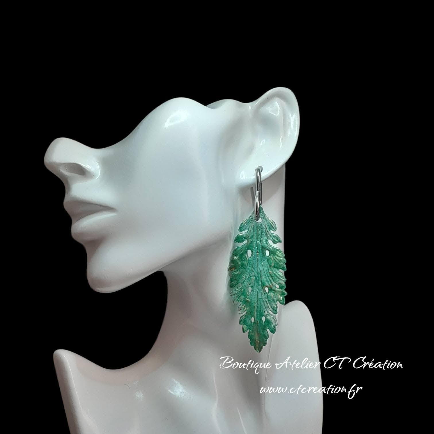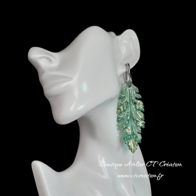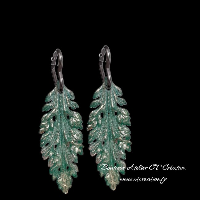 La finition vert patiné mêlée de reflets métallisés dorés crée un effet profond et lumineux, qui capte la lumière à chaque mouvement. Chaque pièce présente de légères variations dans la patine, ce qui rend chaque paire unique.