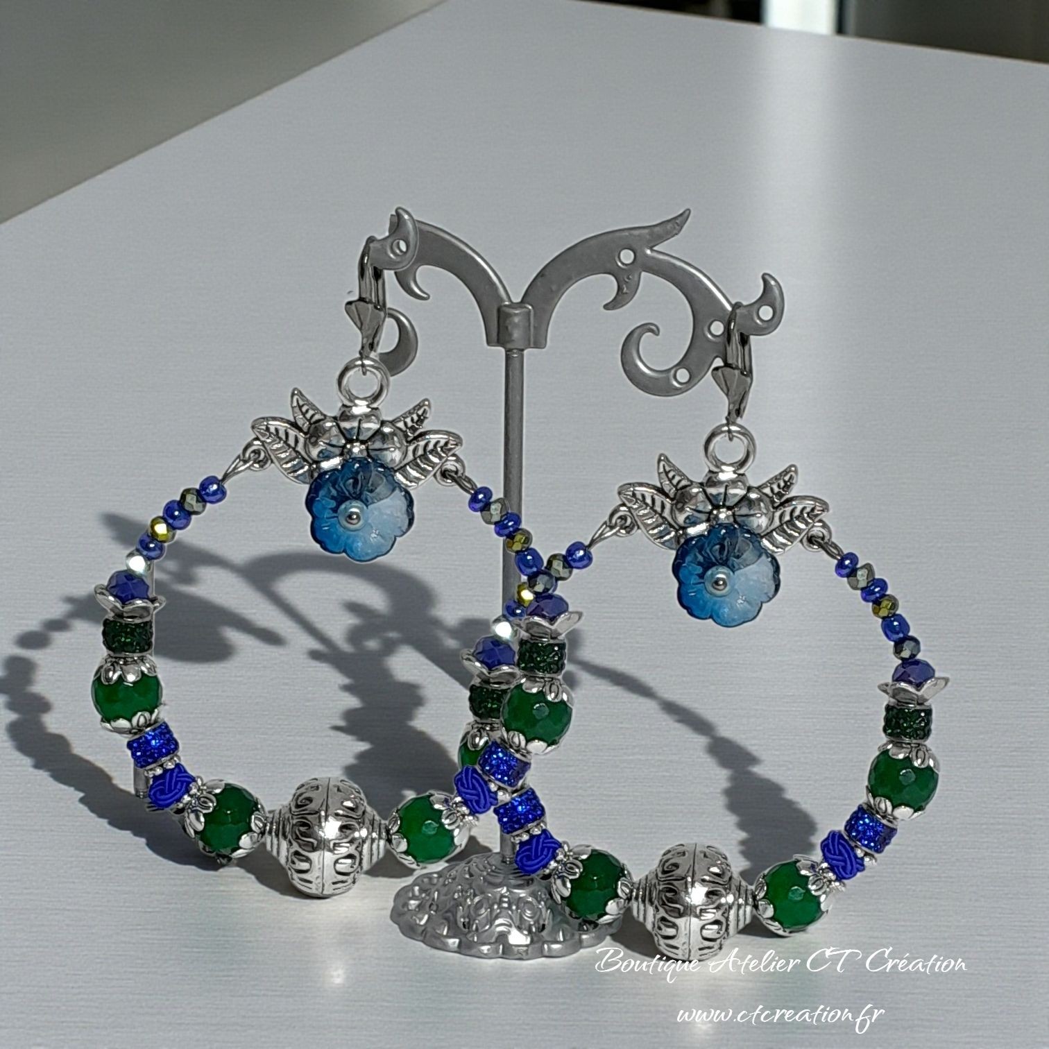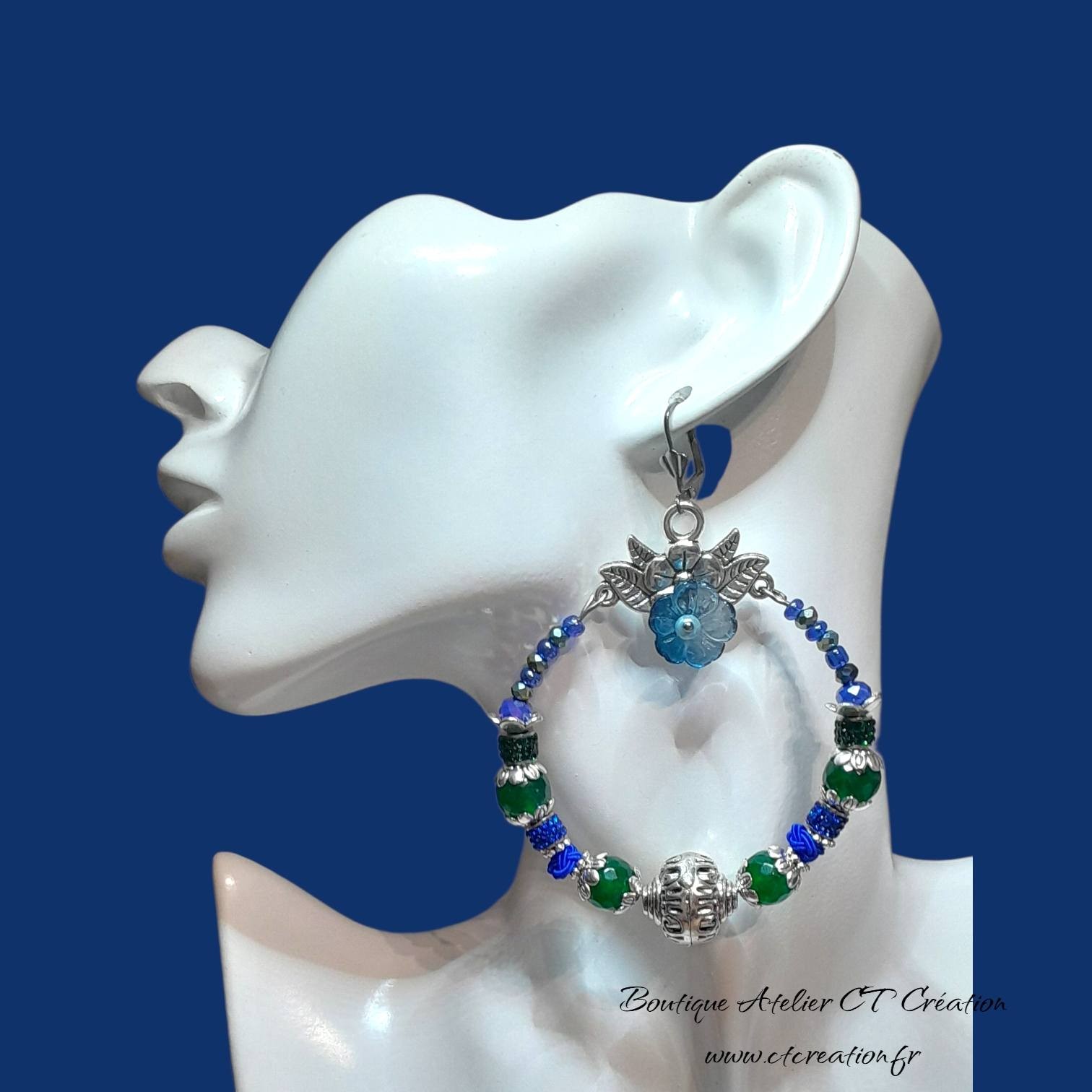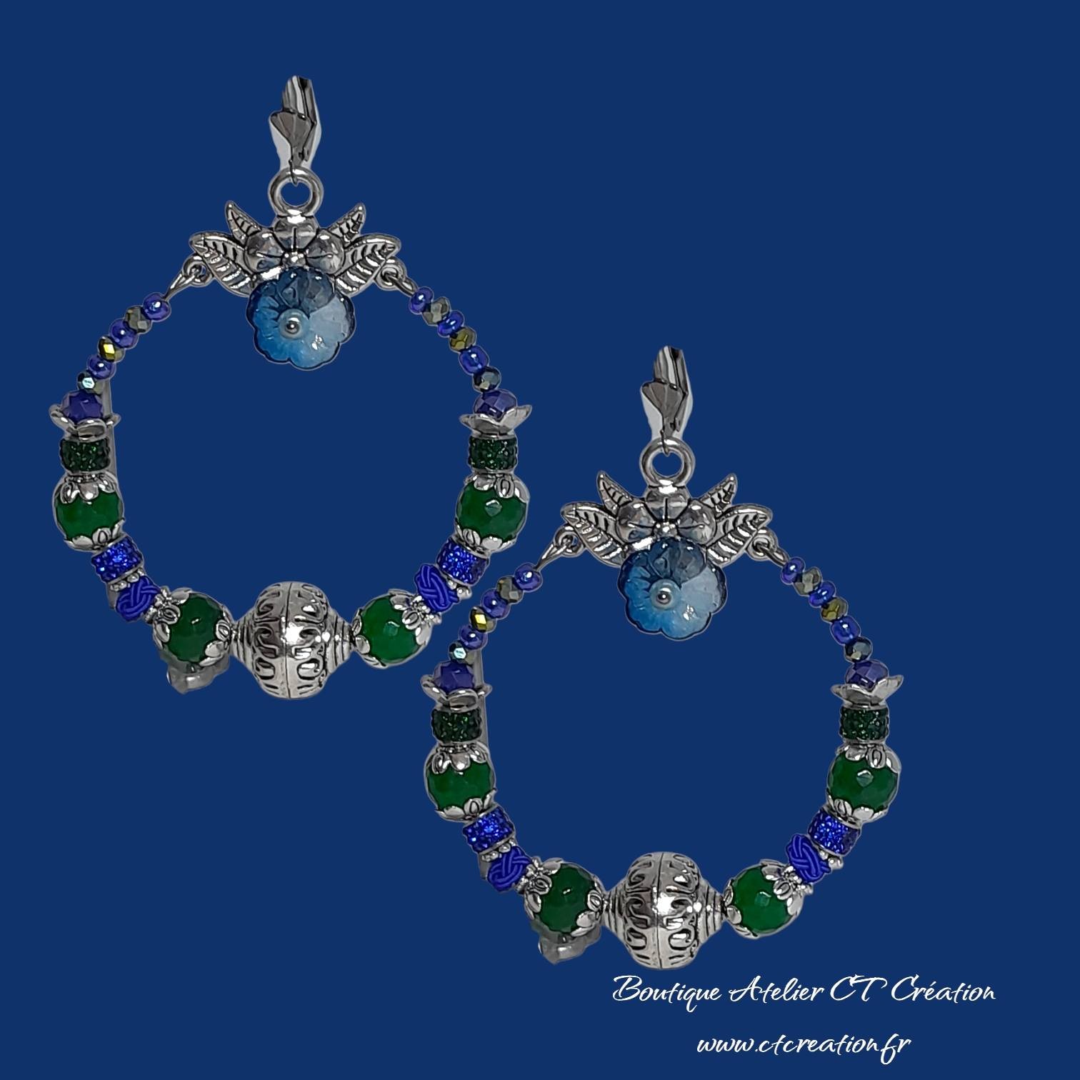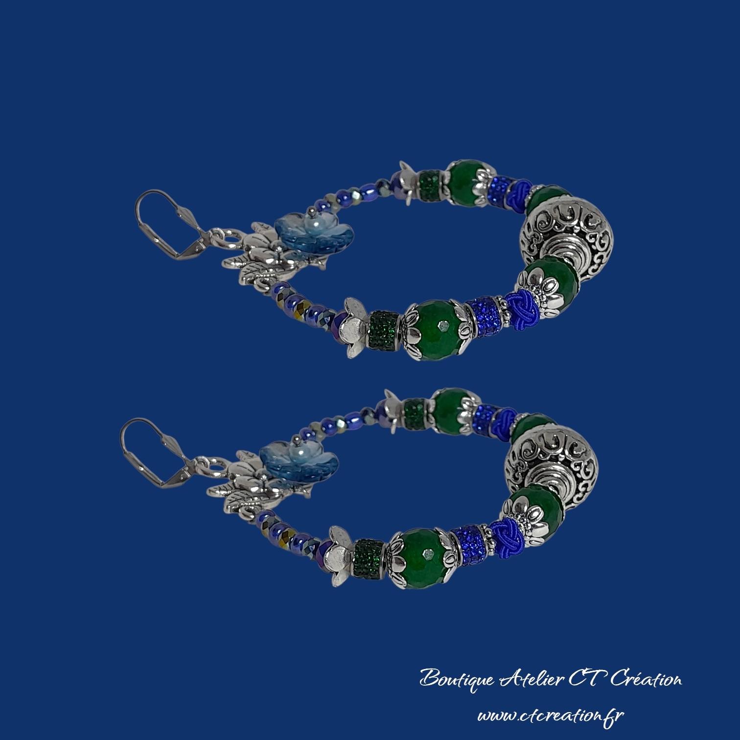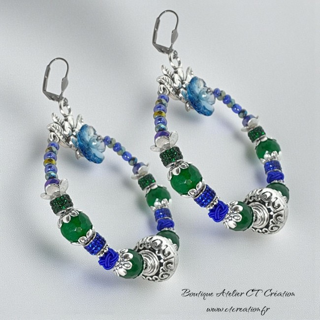 ✨ Ces boucles d’oreilles artisanales sont composées de perles en Jade de Malaisie 10mm facettées, perles en verre à facettes bleues et vertes qui captent magnifiquement la lumière. La fleur centrale en verre tchèque apporte une note romantique et féminineCe bijou est idéal pour les femmes qui aiment se démarquer avec des accessoires uniques et expressifs.