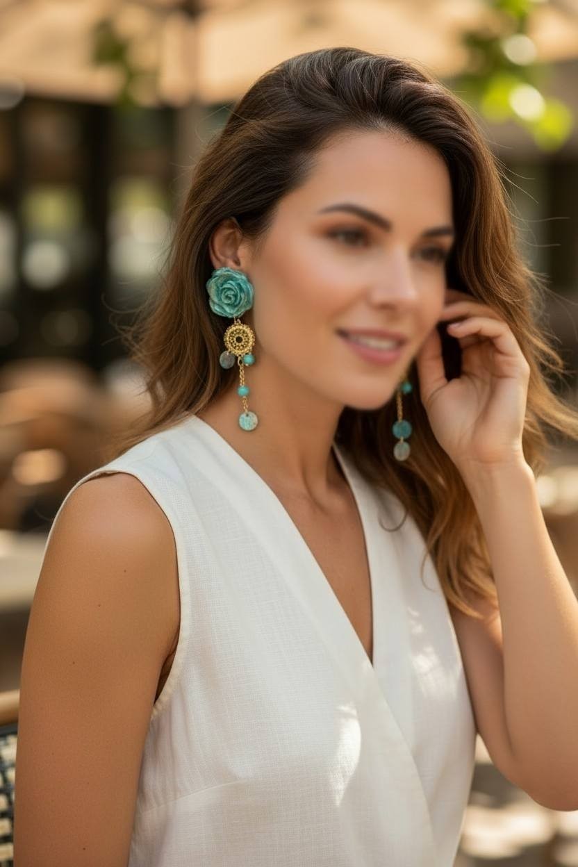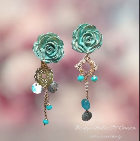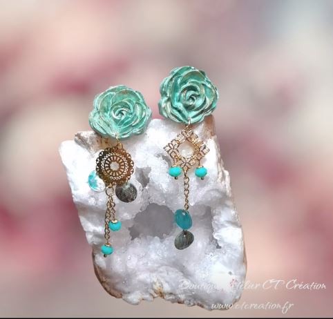 Un modèle plein de charme aux couleurs douces et féminines, elles sont composées de Fleurs réalisées en céramique (25mm), entièrement fabriquées et patinées artisanalement en atelier, intercalaire dentelle de métal doré à l'or fin, pendentifs finition perles en verre à facettes