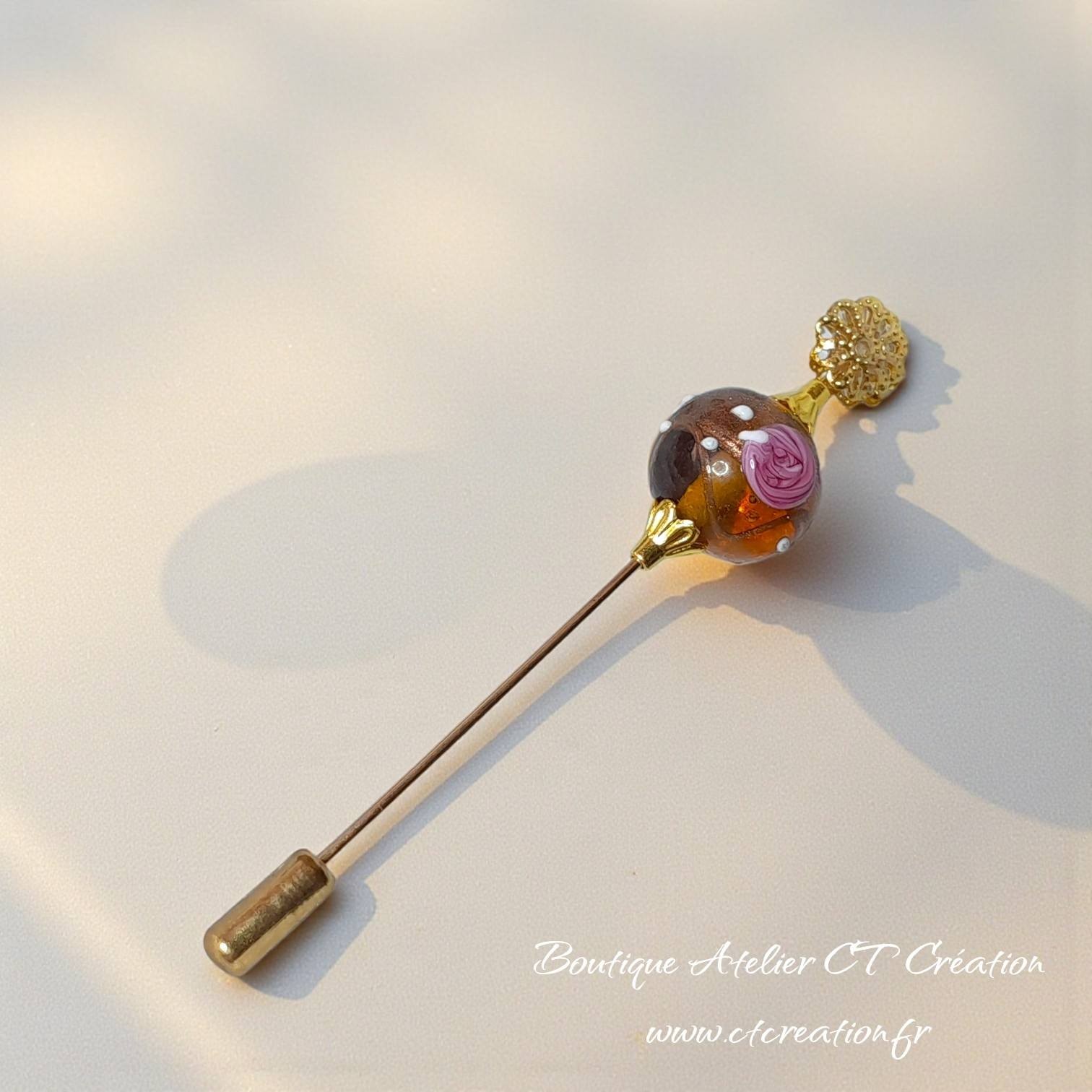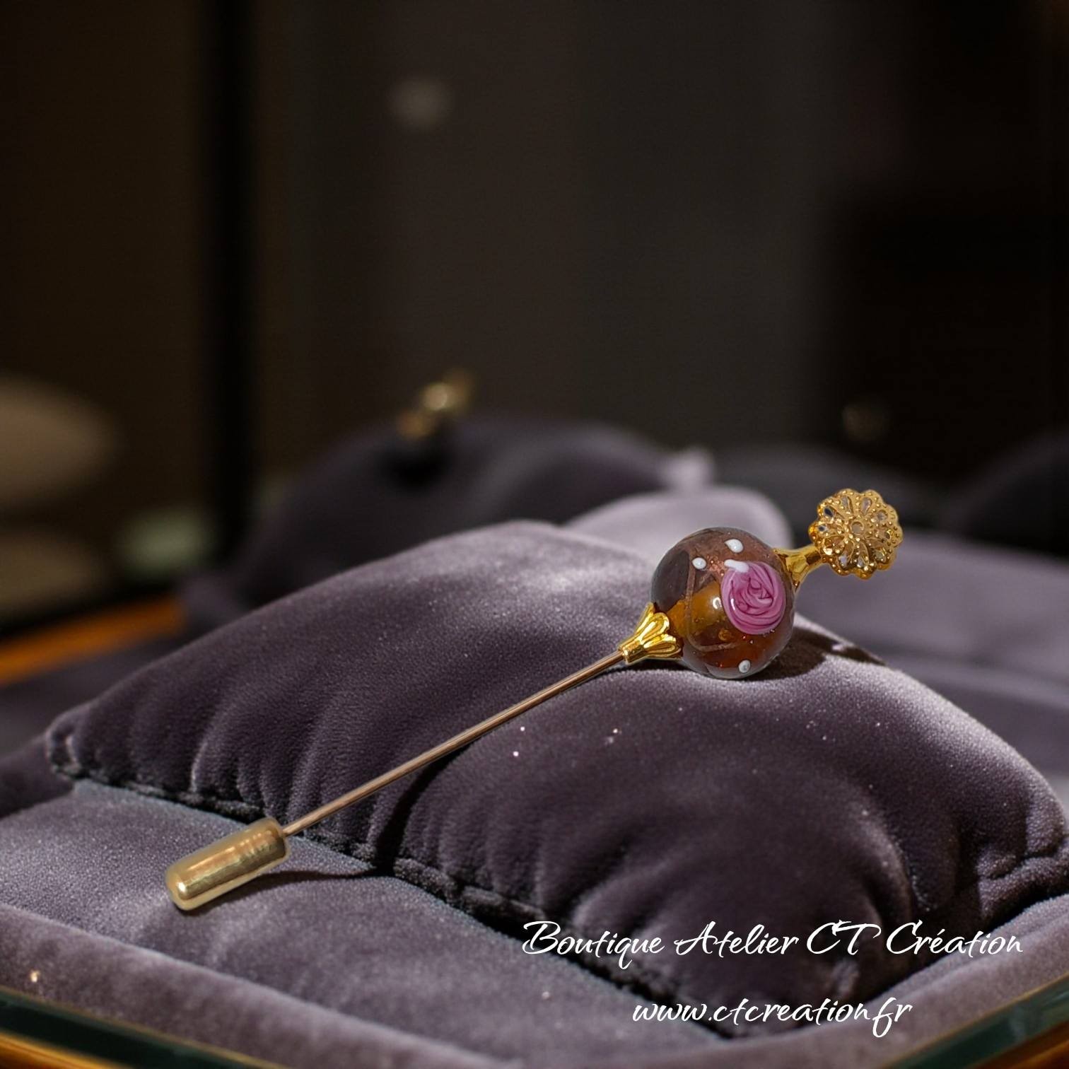 Apportez une touche d’élégance et d’originalité à vos tenues avec cette fibule artisanale unique, réalisée en atelier avec une perle en verre de Murano décor Floral, finition petites rosace en acier doré