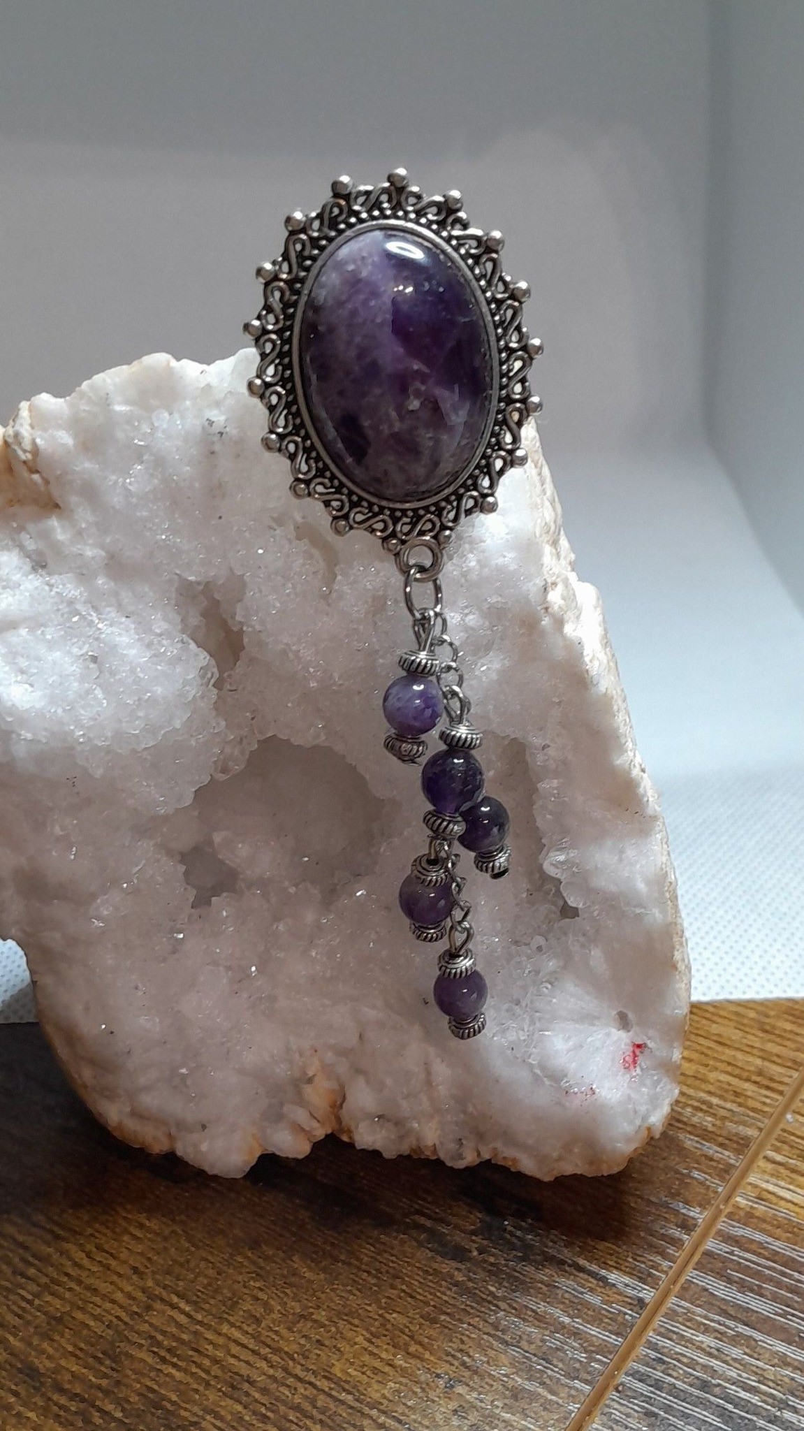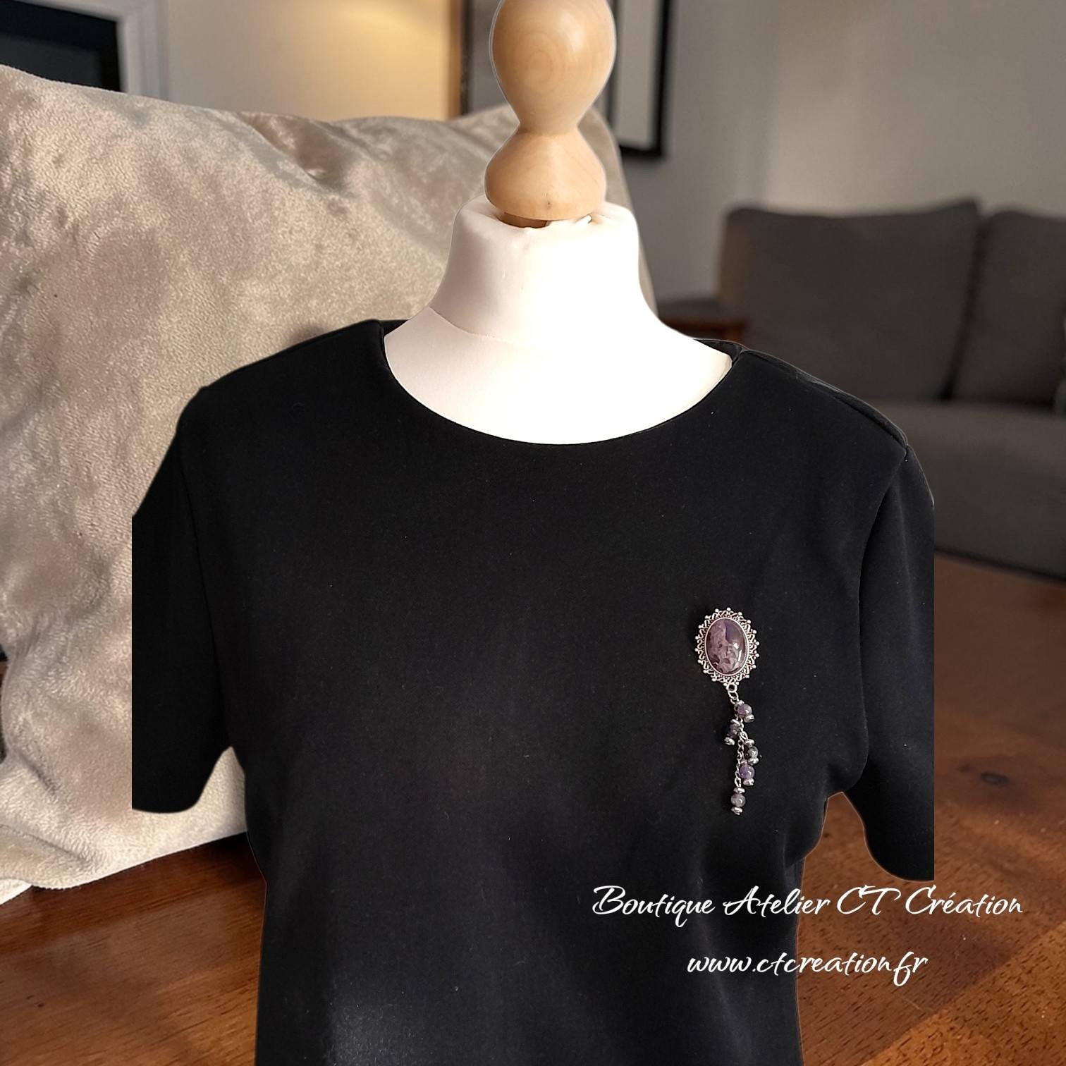 Élégante et raffinée, cette broche met en valeur une magnifique pierre naturelle d'Améthyste extra aux reflets violets profondes et marbrées, montée en cabochon ovale.
