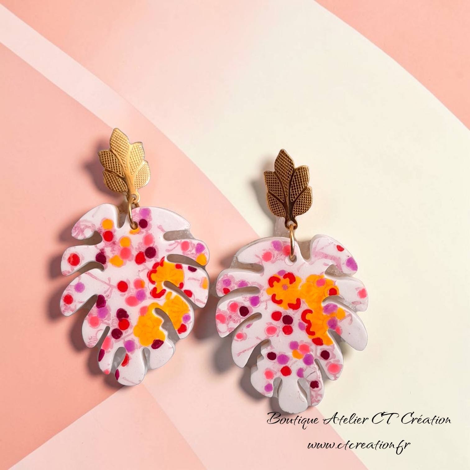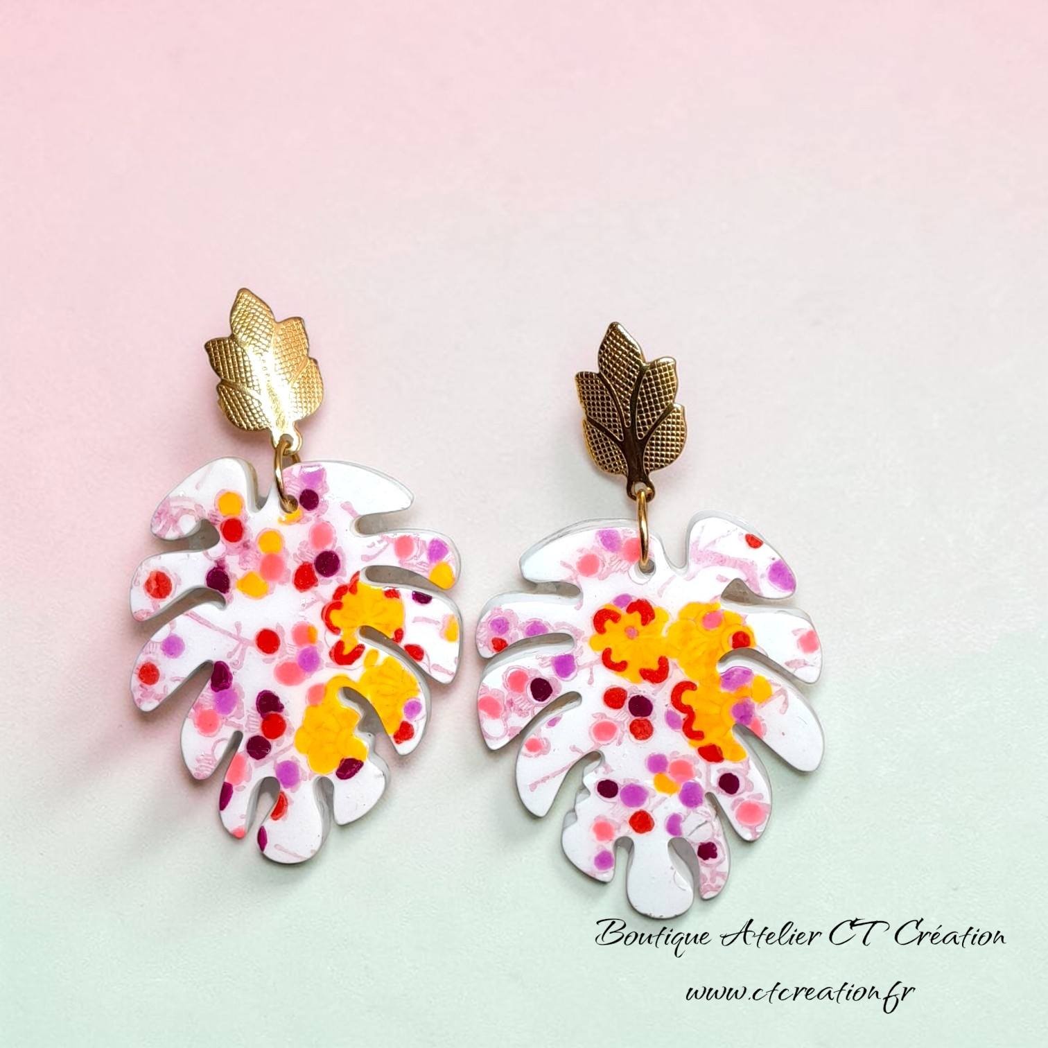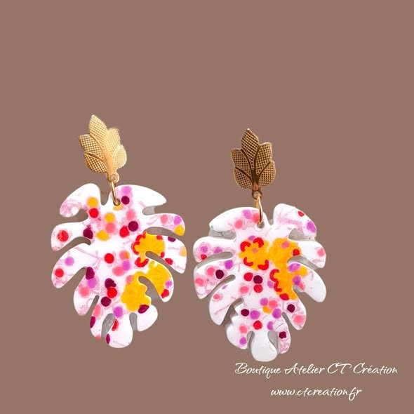 Leur forme de feuille exotique est sublimée par un motif floral aux couleurs vives — rose, rouge, orange, parme et violet — pour un rendu unique et artistique.