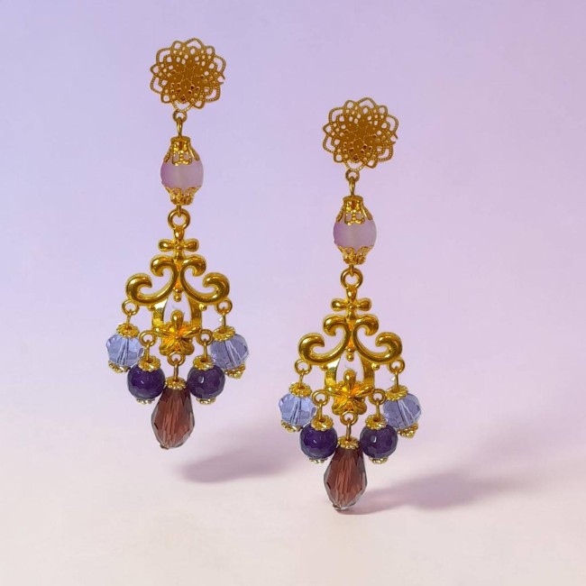 Magnifiques Boucles d’Oreilles pendentifs composées de perles facettées en améthyste extra du Brésil, perles goutte en verre et perles rondelles en cristal coloris parme