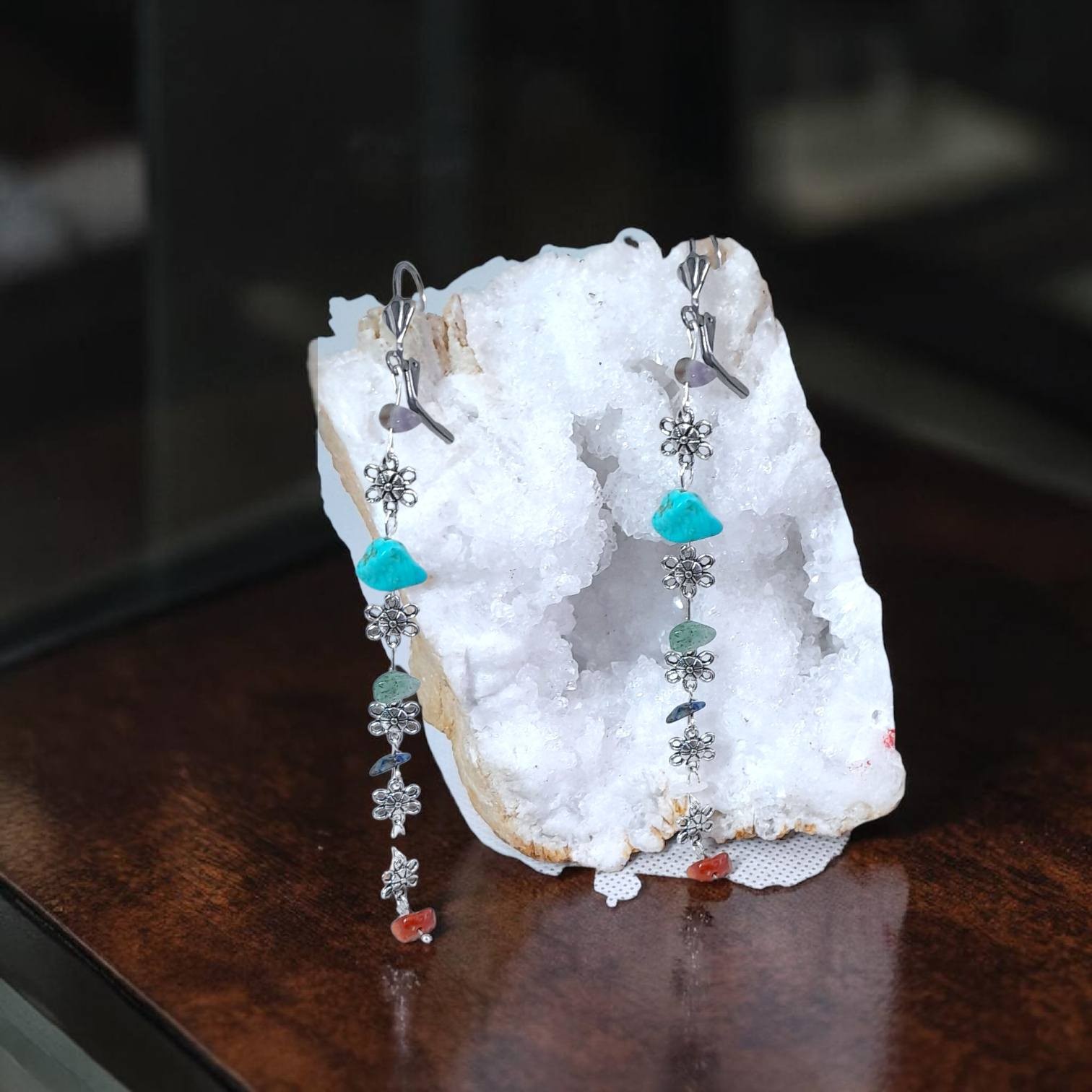 Boucles d'oreilles longs pendentifs perles chips baroques 7 chakras intercalées de fleurs en laiton argenté